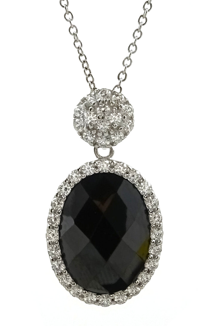 Crafted in sterling silver with a black resin stone centerpiece surrounded by CZ accents. Suspended from a sterling silver chain.