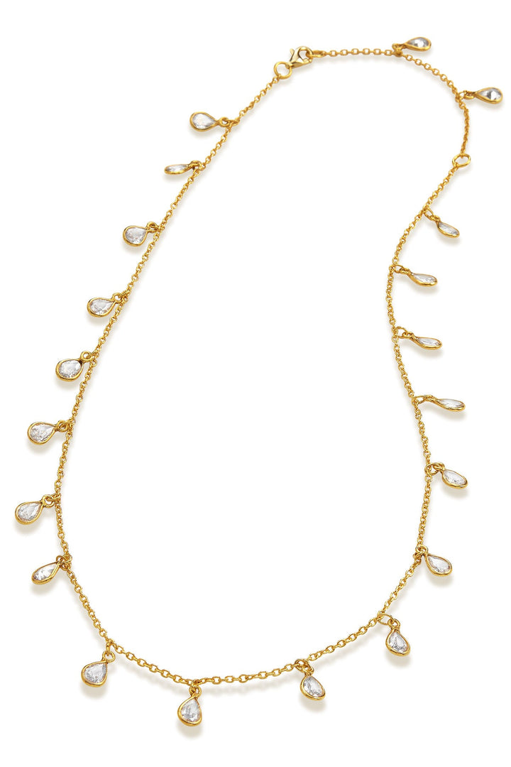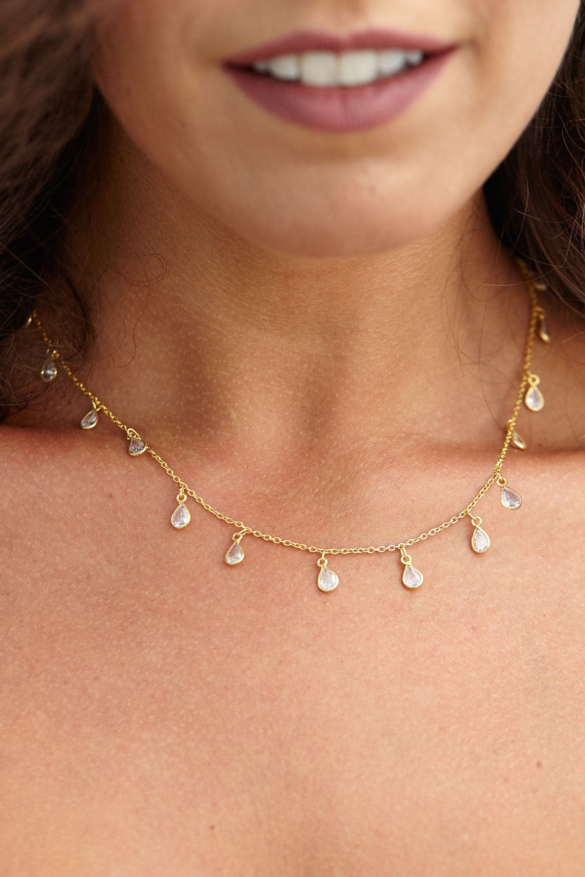 This Sterling Silver Tear Drop Necklace by Savvy Cie is a delicate yet radiant piece. Featuring pear-shaped cubic zirconia charms along a dainty sterling silver chain, this necklace offers a subtle sparkle that enhances any look. Ideal for layering or wearing solo, it transitions seamlessly from casual to formal occasions.