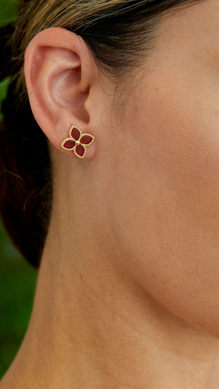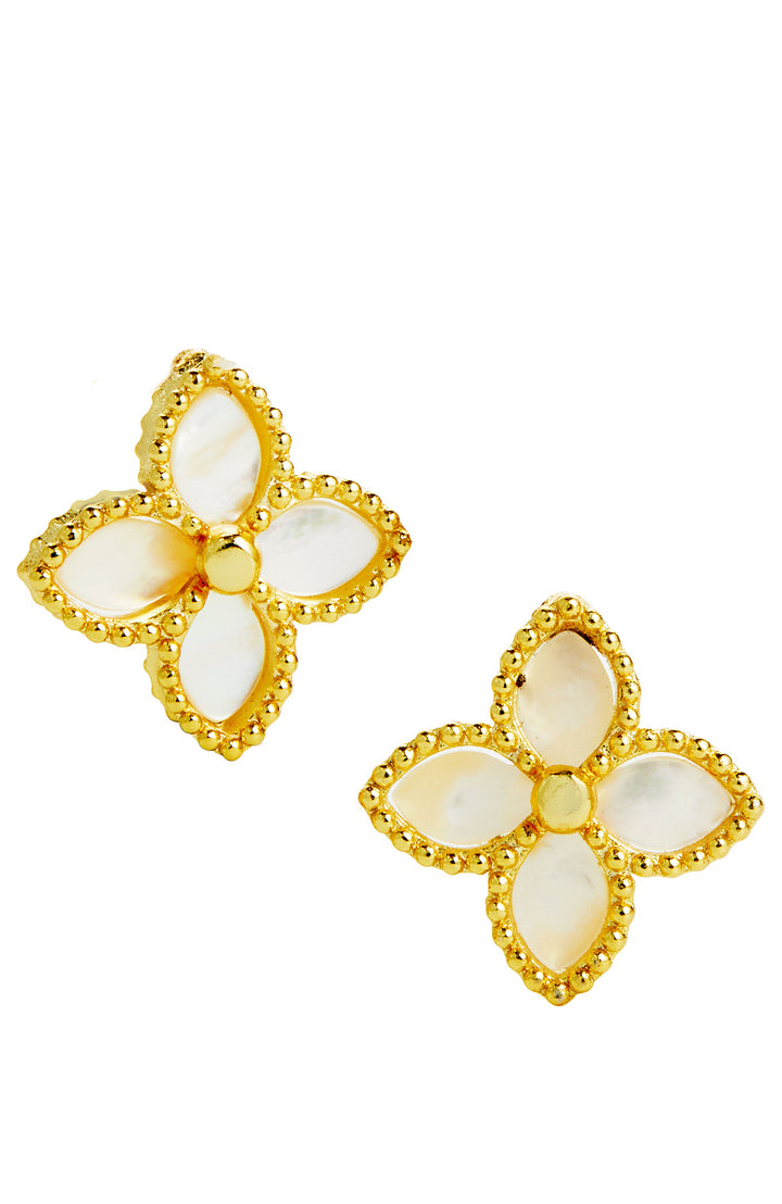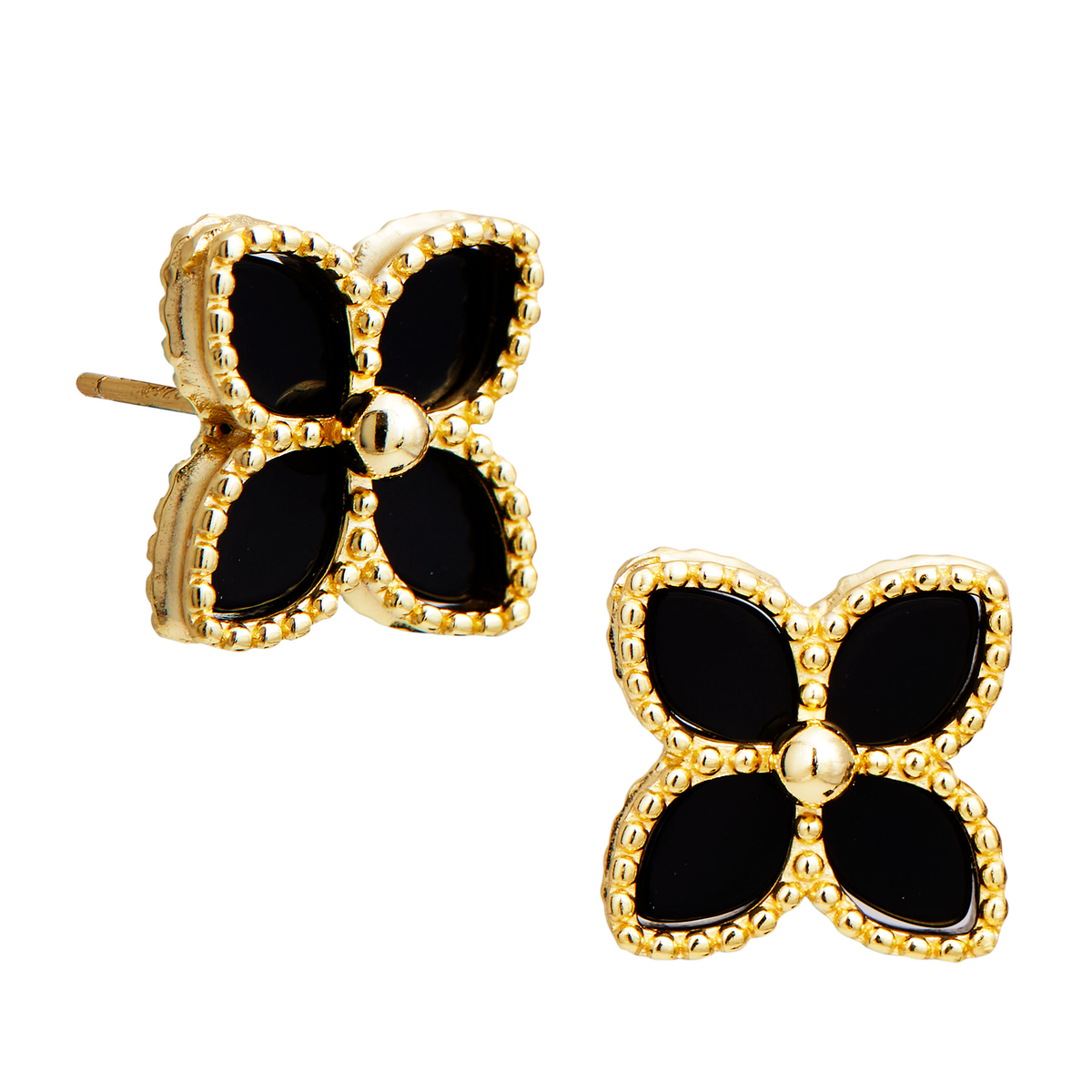 These 18K Yellow Gold Vermeil Agate Flower Station Stud Earrings by Savvy Cie exude femininity and elegance. Featuring genuine agate flower stations, these lustrous gold vermeil studs are a refined and timeless choice, perfect for everyday sophistication or special occasions.
