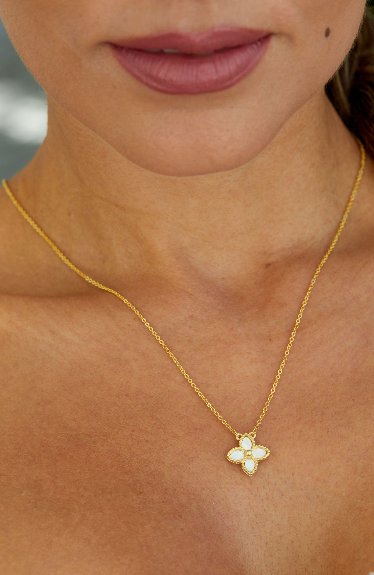 Crafted in 18k yellow gold vermeil over sterling silver with a genuine mother of pearl flower pendant. Suspended from a delicate chain.