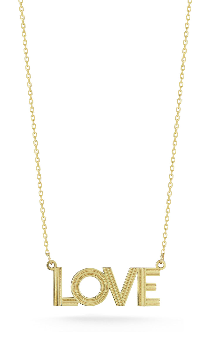 This 14K Gold Love Necklace by Ember Fine Jewelry is a bold and modern take on a timeless sentiment. Designed with a vintage-inspired lined font, this solid gold pendant is an everyday staple that symbolizes the beauty of love in its purest form.