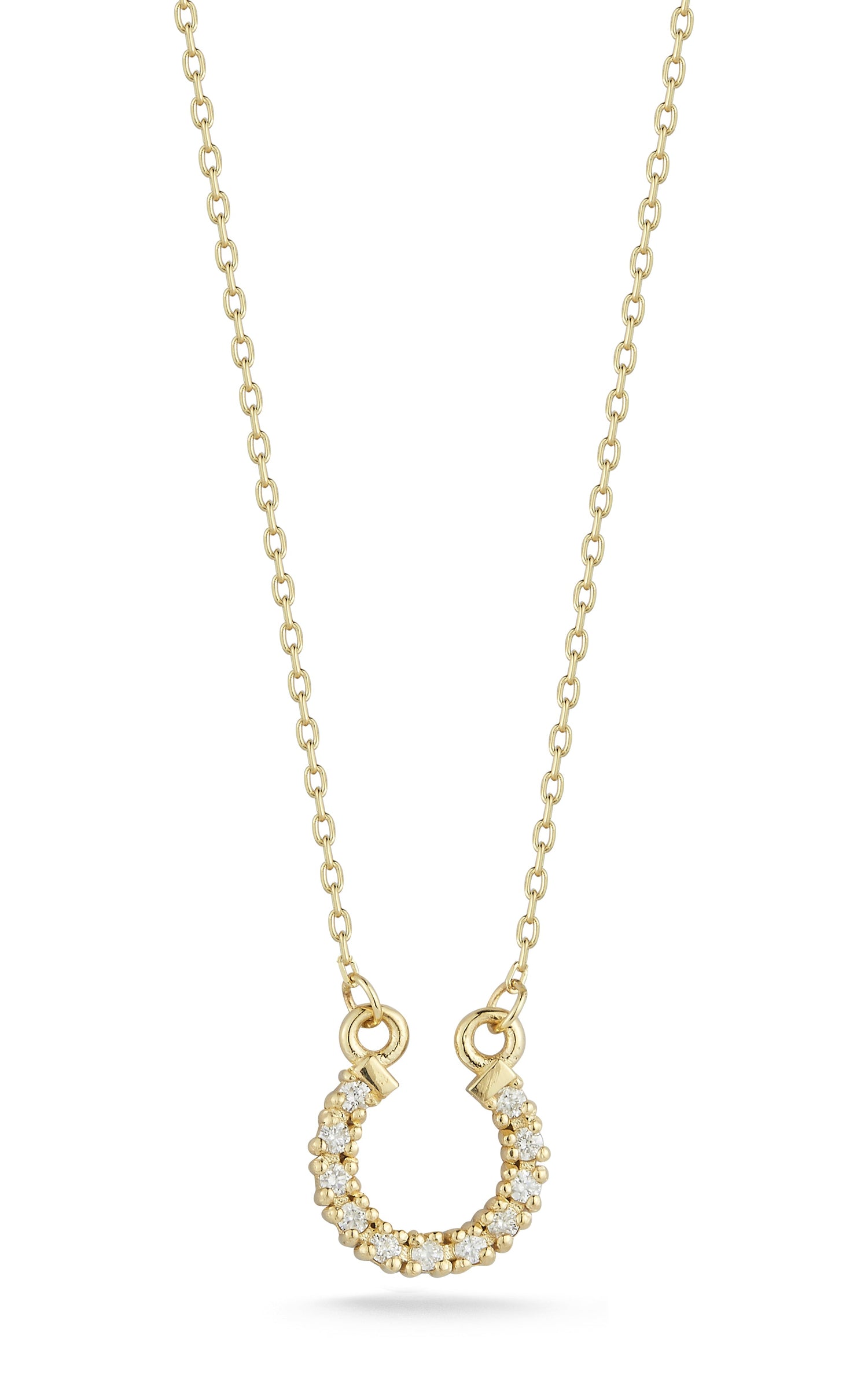 This 14K Gold & Diamond Horseshoe Necklace by Ember Fine Jewelry is a symbol of good fortune and protection. Adorned with sparkling natural diamonds, this piece offers a refined take on a classic lucky charm. Perfect for layering or wearing alone as a delicate statement.