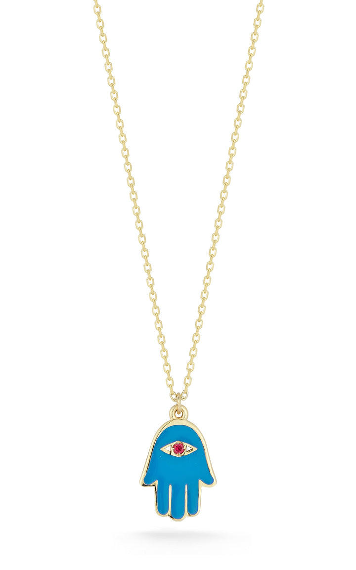 This 14K Gold & Ruby Hamsa Necklace by Ember Fine Jewelry is a beautifully crafted talisman of unity and protection. Featuring a hand-painted turquoise enamel Hamsa and a striking ruby accent, this piece blends cultural symbolism with elegant craftsmanship.