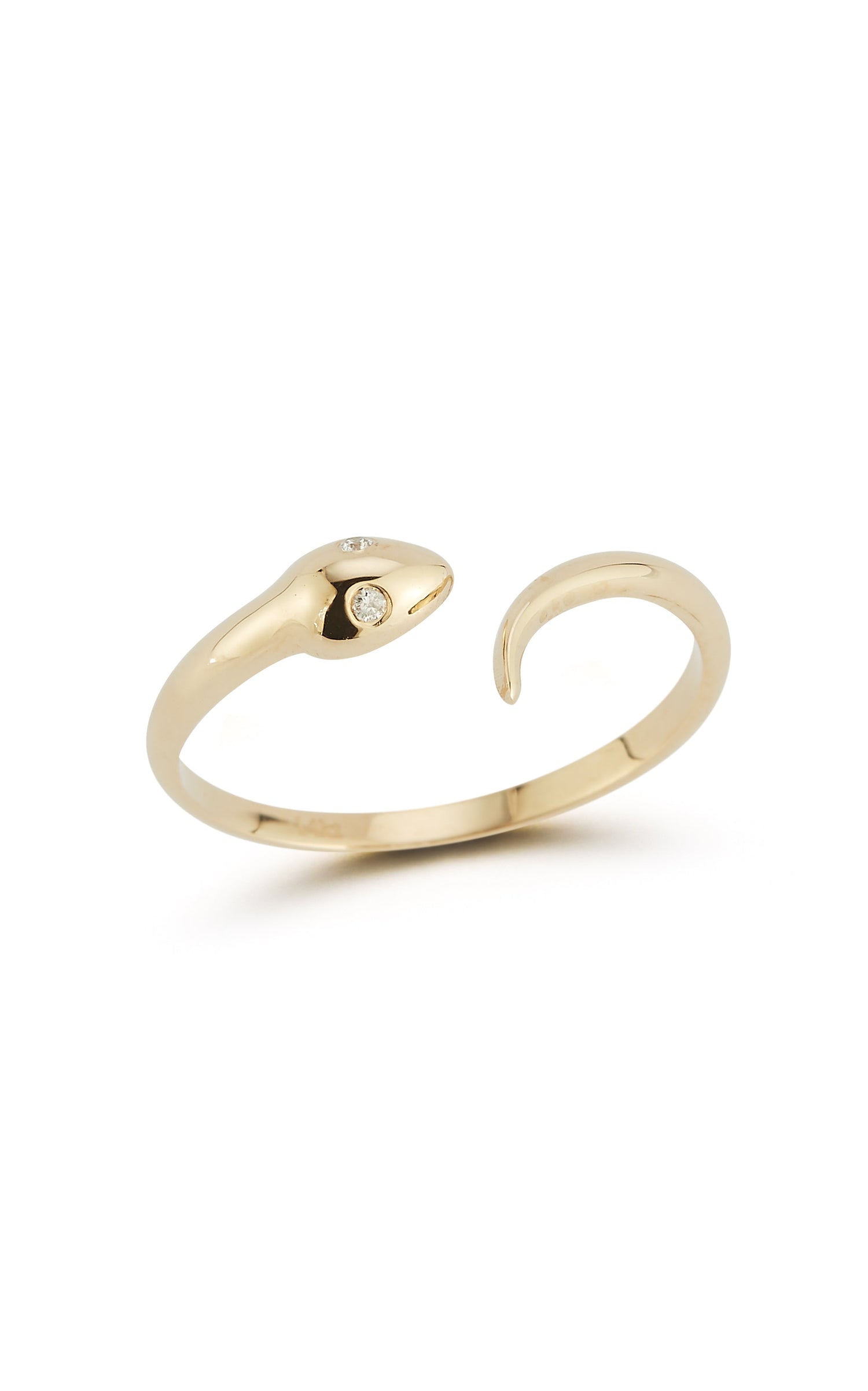 This 14K Gold & Diamond Snake Ring by Ember Fine Jewelry is a sleek and sophisticated symbol of eternity and rebirth. The sinuous design is accented with gleaming diamond eyes, making it a bold and captivating statement piece.