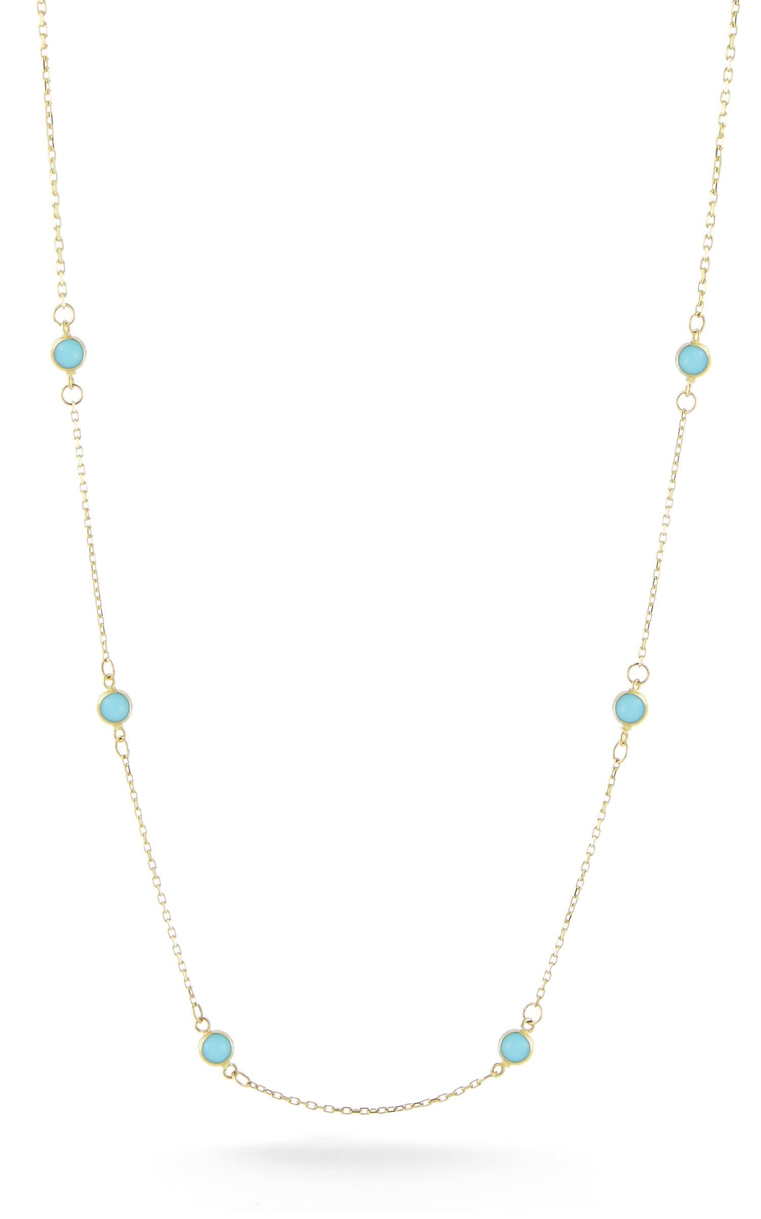 Handcrafted in 14K gold with turquoise gemstones. Length: approximately 18'. Closure: spring ring clasp. Tarnish-resistant and durable for everyday wear.