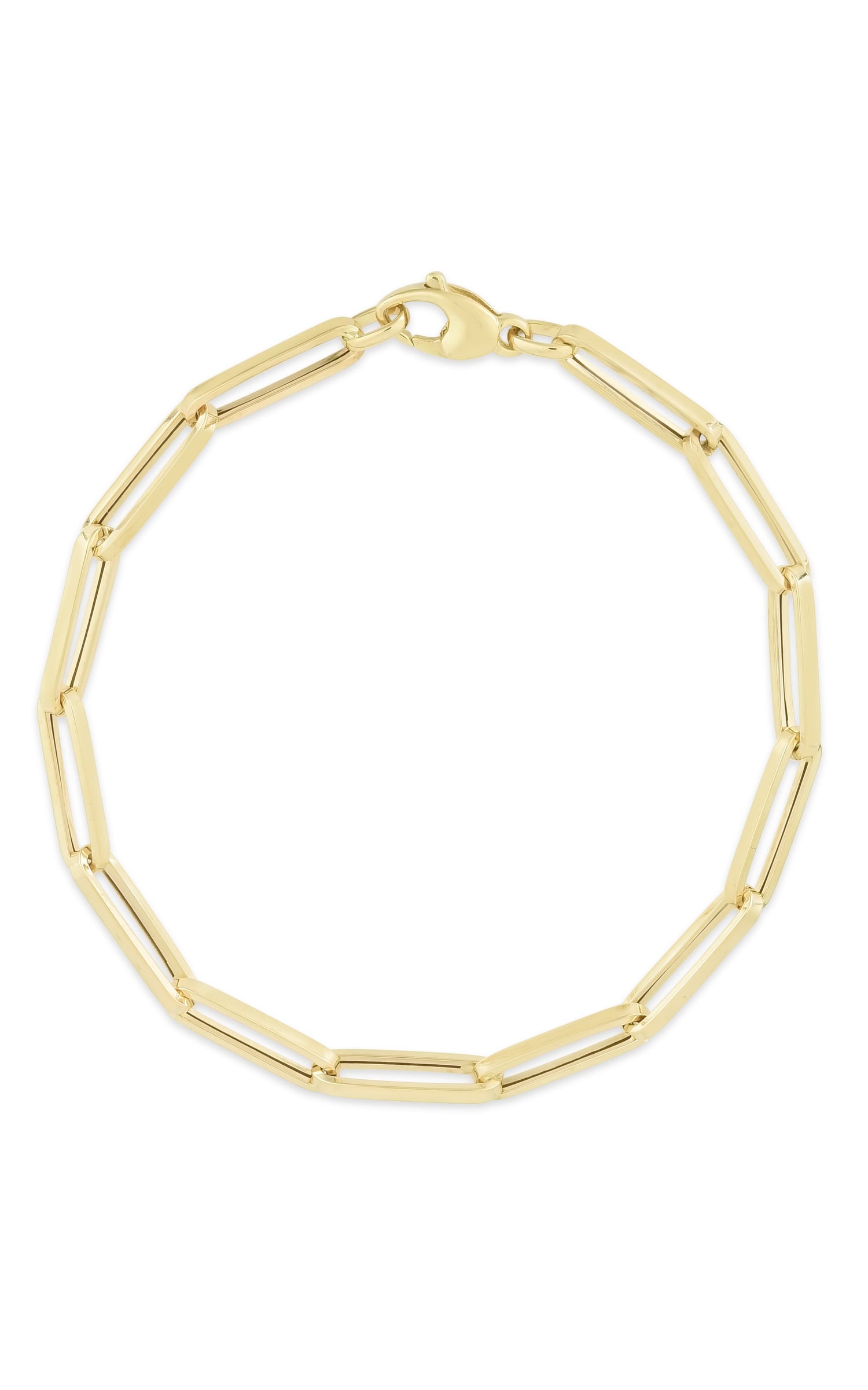 This 14K Italian Gold Paperclip Link Bracelet by Ember Fine Jewelry brings modern elegance to your wrist with its minimalist yet bold design. The contemporary paperclip links create a sleek and sophisticated look, whether worn alone or stacked with other bracelets for a layered effect.