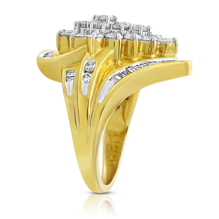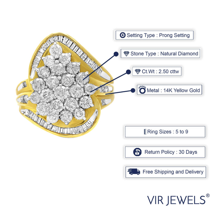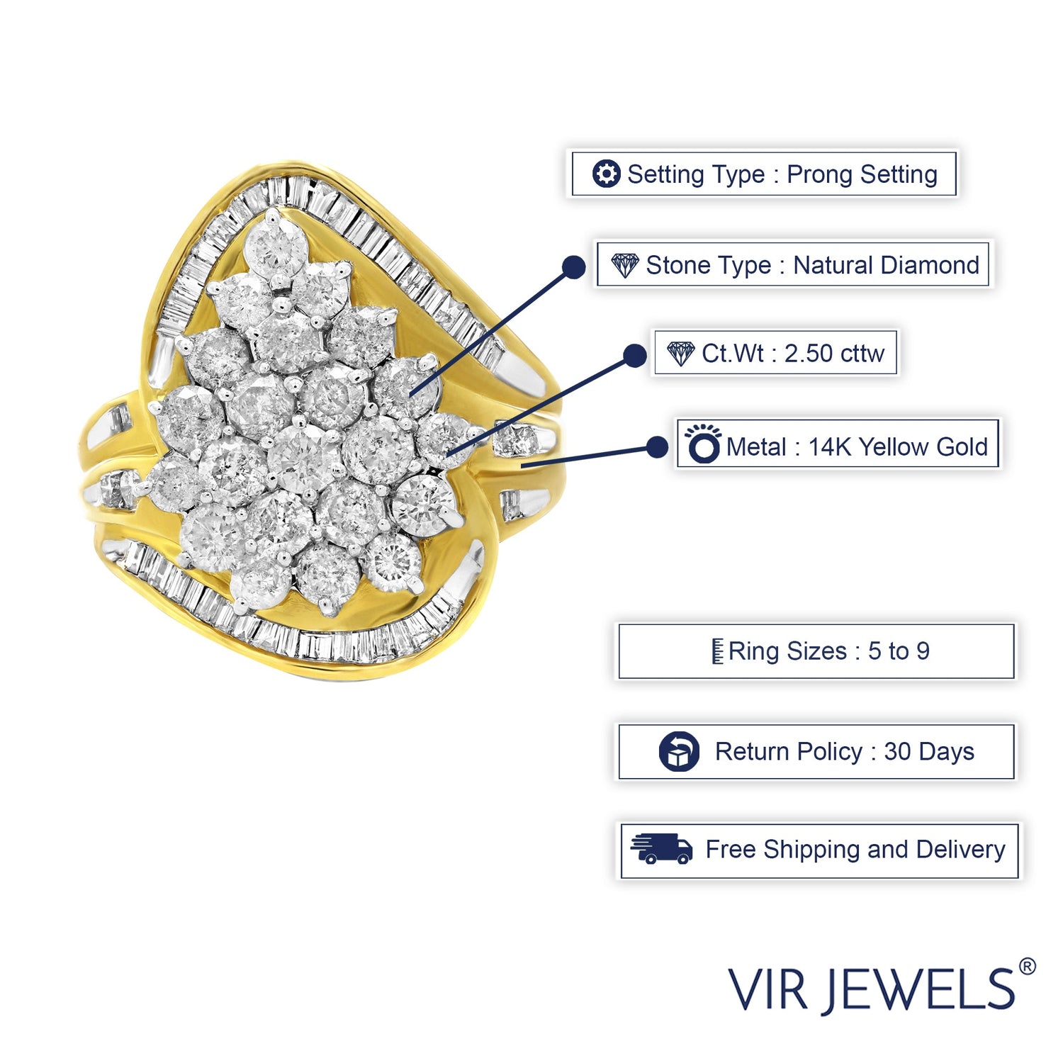 Handcrafted in 14K yellow gold. Features natural diamonds with a total carat weight of 2.50 cttw. Diamond shape: round. Designed as a timeless statement ring. Birthstone month: April. Includes a gift box.