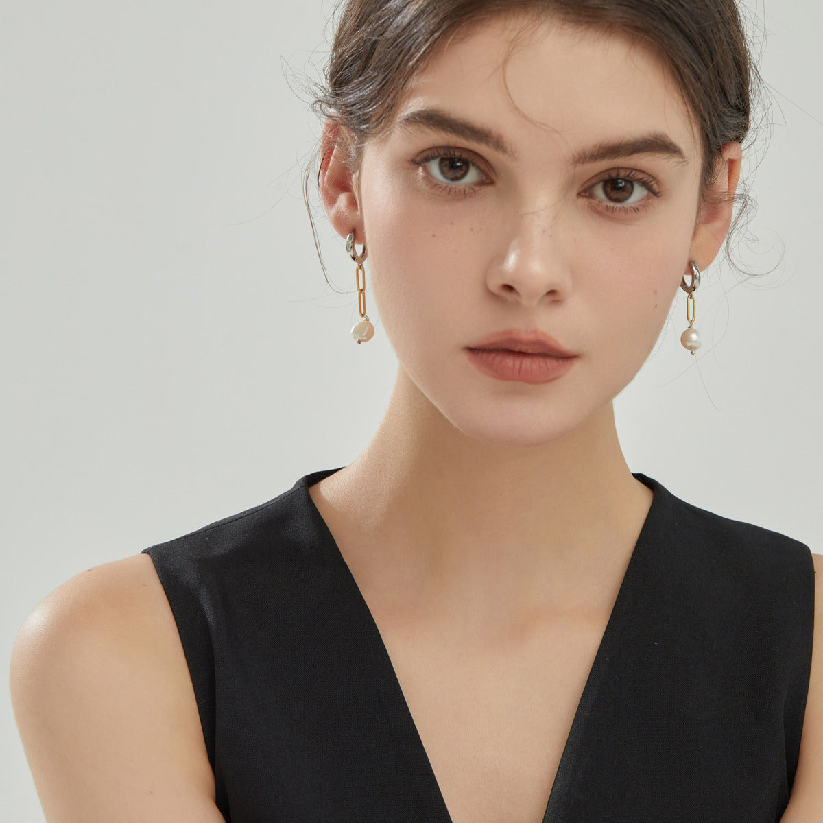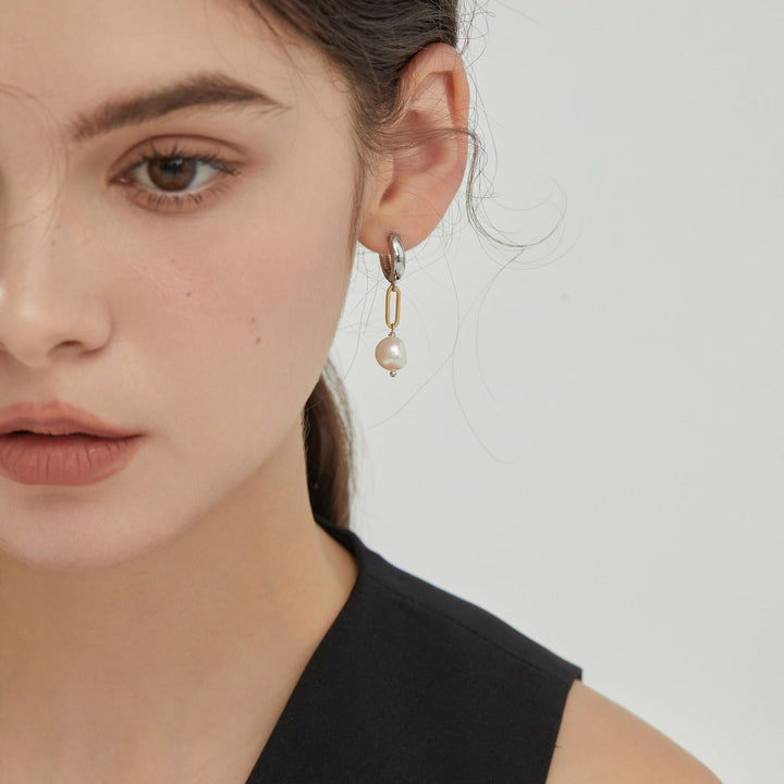 Handcrafted with 18kt gold-plated paperclip chains and silver-plated huggies. Features freshwater pearls. Asymmetric design for a modern, statement look.