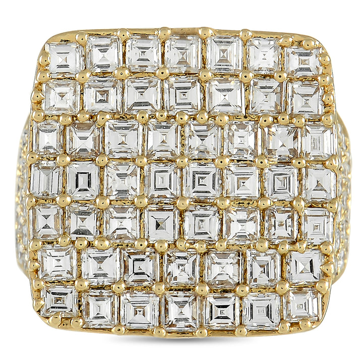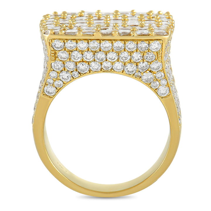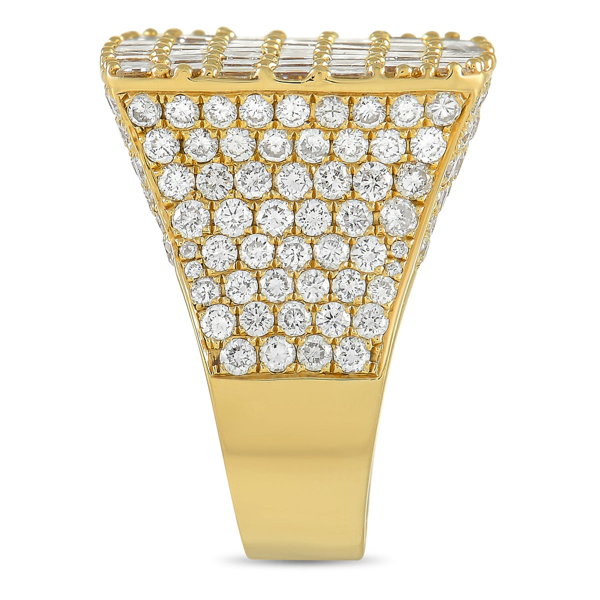 This 14K Yellow Gold 10.49 ct Diamond Ring by Luxury Bazaar is a bold statement of opulence and grandeur. Designed to command attention, this substantial ring features a broad 10mm band with an 8mm top height, encrusted with a dazzling array of diamonds totaling 10.49 carats. Its striking presence ensures a timeless, high-impact look.