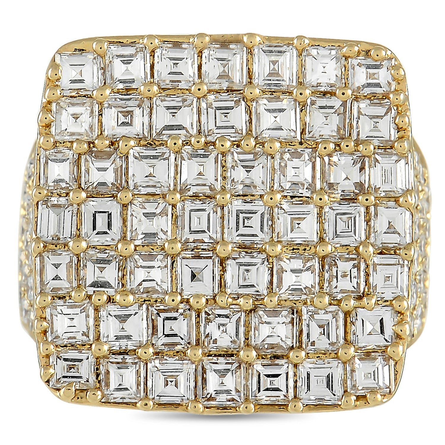 Crafted in 14K yellow gold. Features natural diamonds totaling 10.49 ctw. Band width: 10mm; Top height: 8mm. Includes gift box.