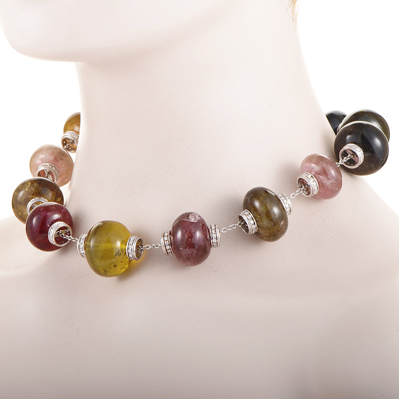 Crafted in 18K white gold. Features multi-colored natural tourmalines. Accented with 4.90 ctw of natural diamonds. Choker length. Includes gift box.