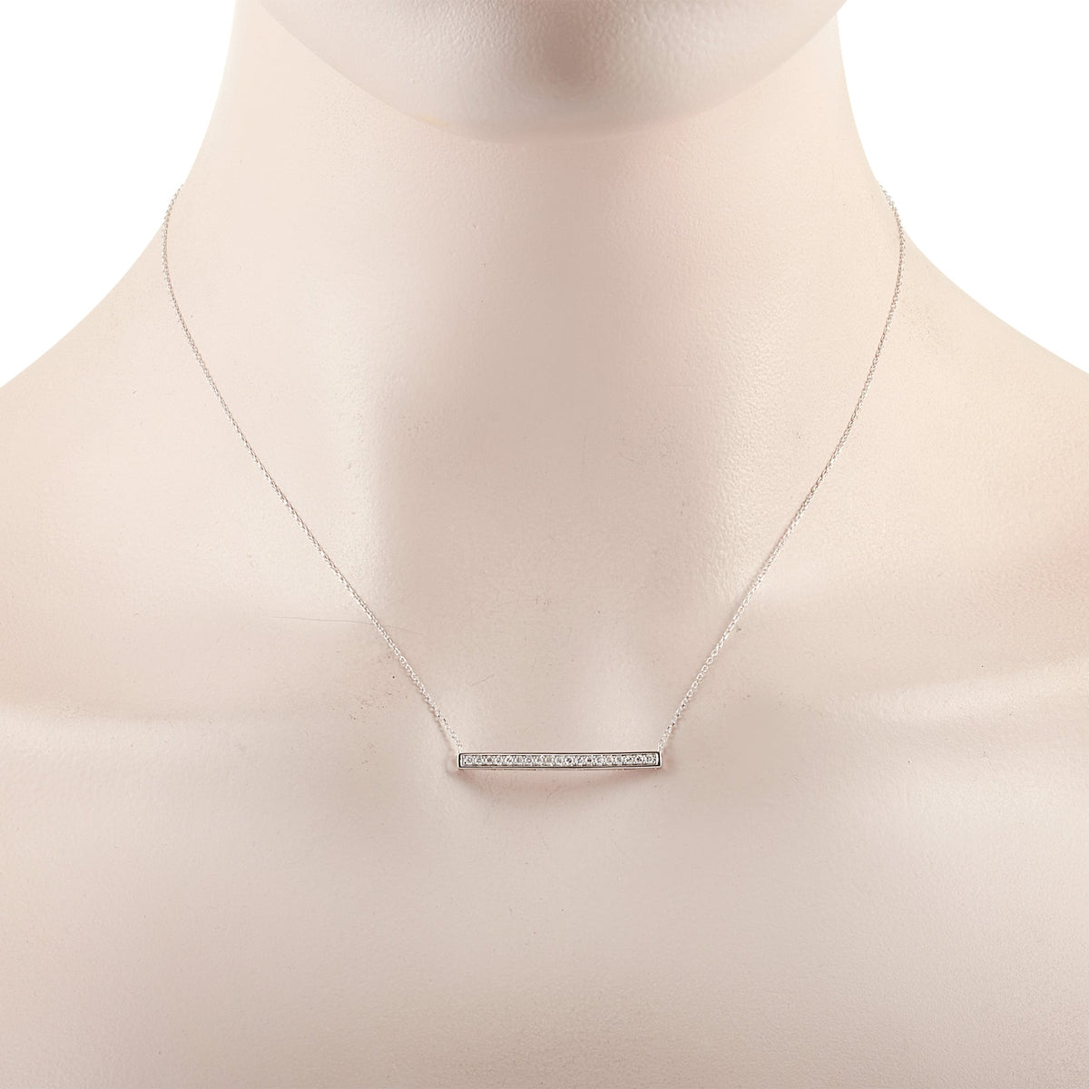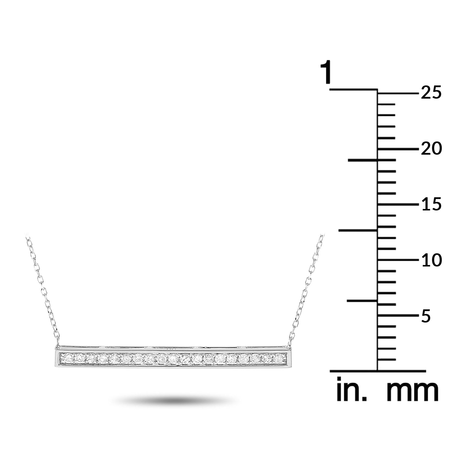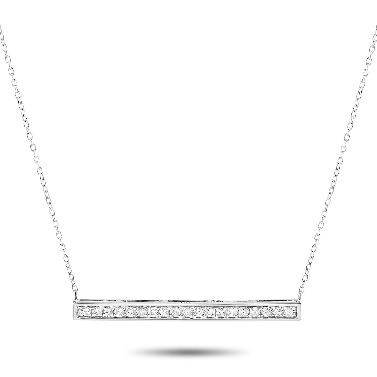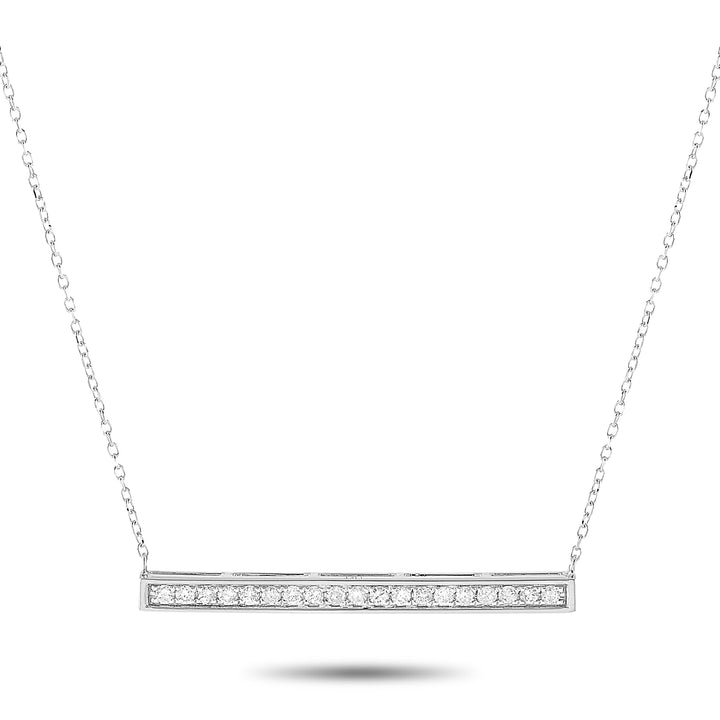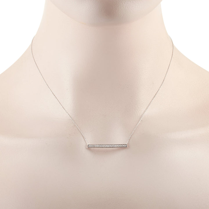 Crafted in 14K white gold. Features 0.25 ctw of natural diamonds. Pendant dimensions: 0.13 inches in length, 1.25 inches in width. Chain length: 15 inches. Weight: 2.1 grams. Includes gift box.