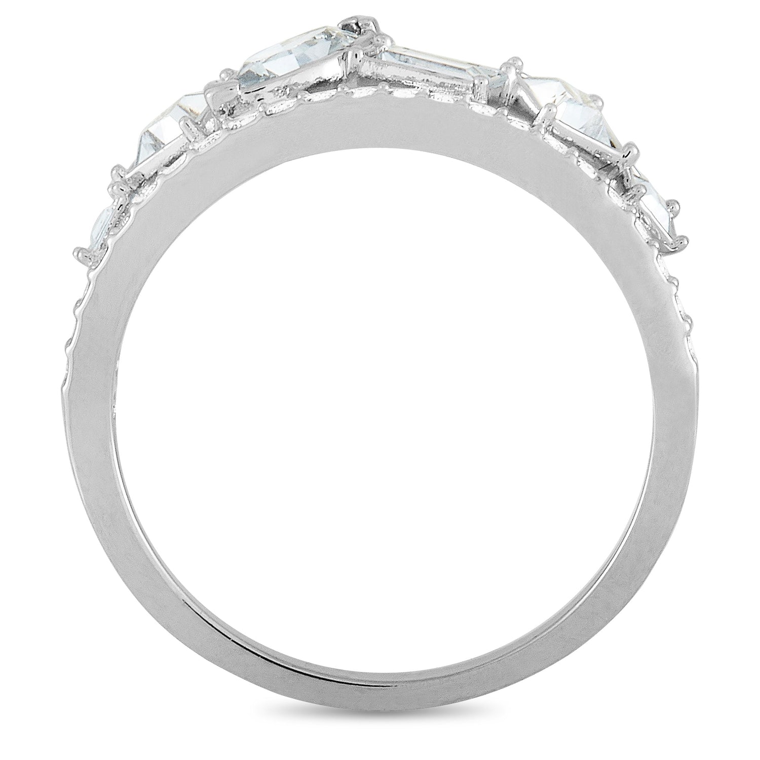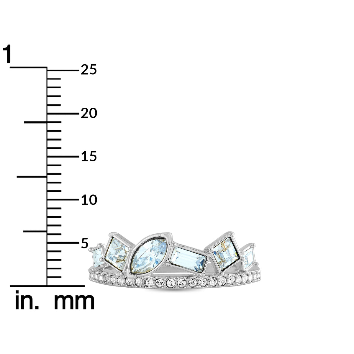 Crafted in rhodium-plated stainless steel. Features clear Swarovski crystals. Band thickness: 1mm. Top height: 3mm. Top dimensions: 20mm x 6mm. Weight: 2.3 grams. Includes manufacturer’s box and papers.