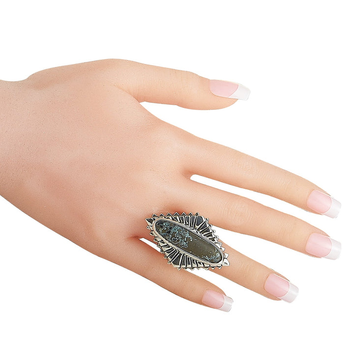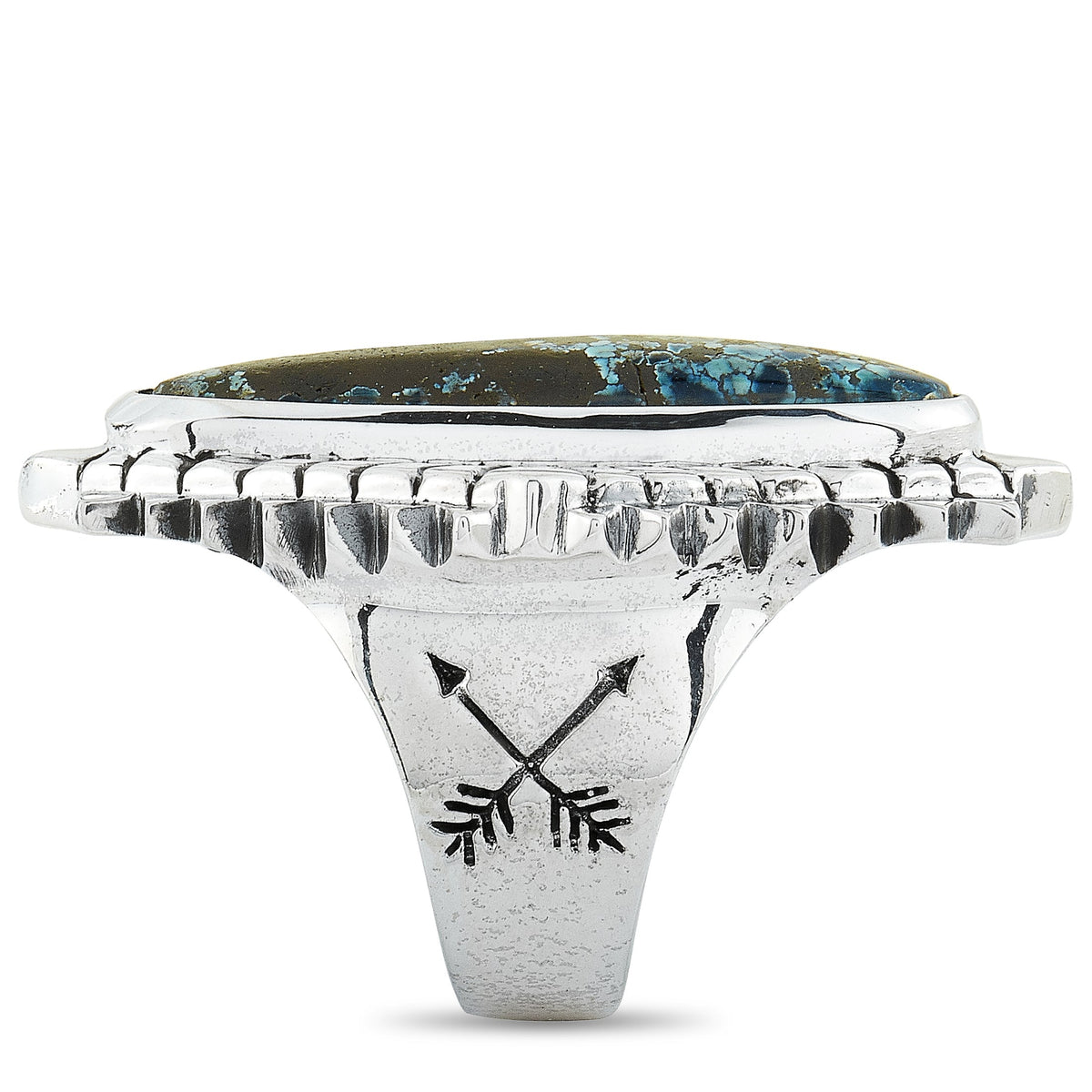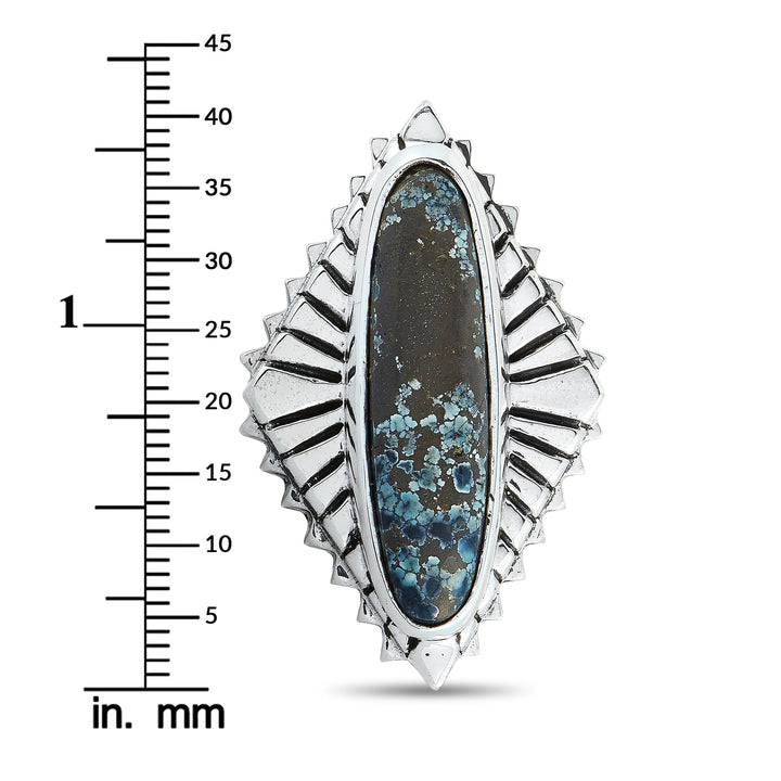 Crafted in sterling silver. Features a natural spotted turquoise stone. Band thickness: 7mm. Top height: 9mm. Top dimensions: 30 x 41mm. Weight: 44.6 grams. Includes manufacturer’s box.