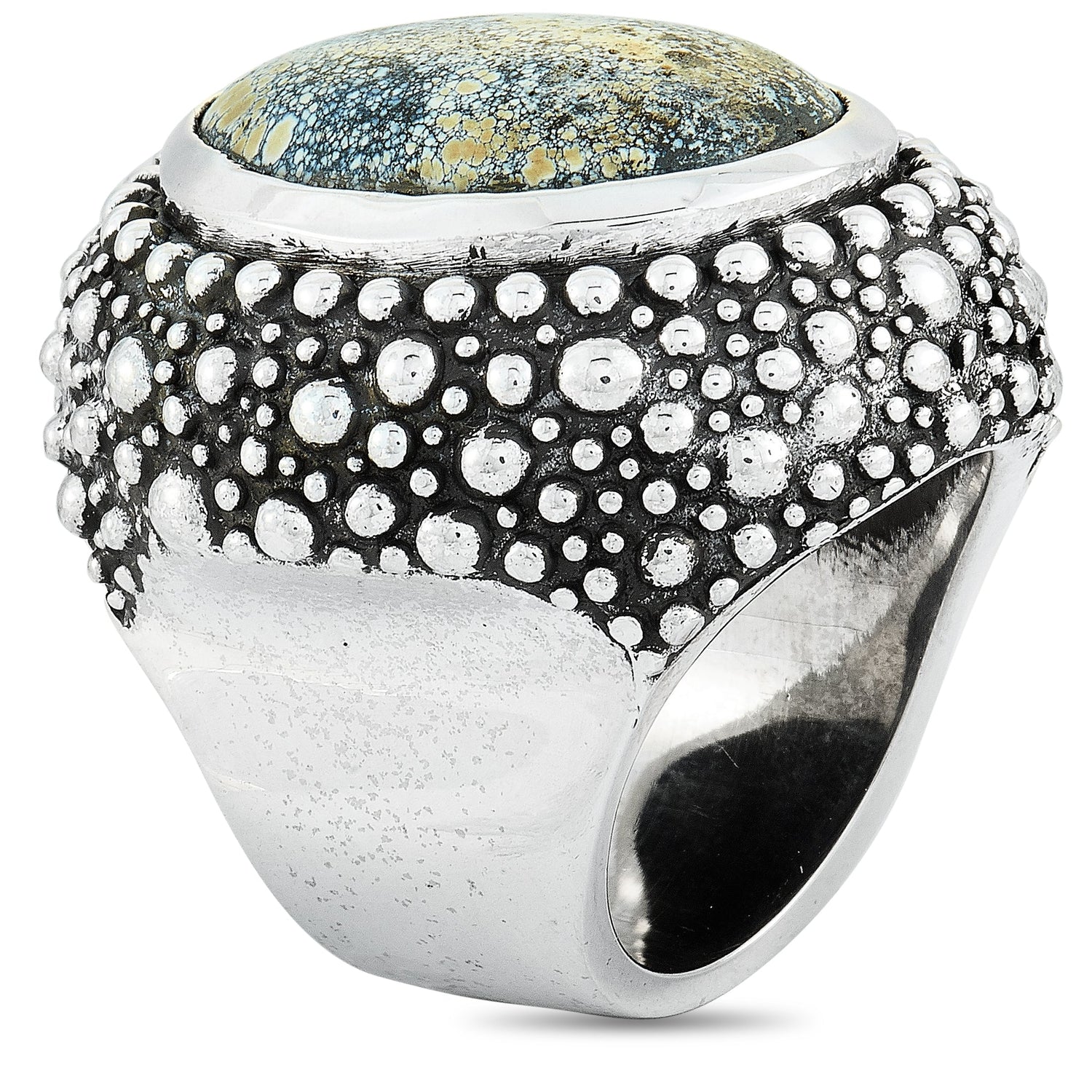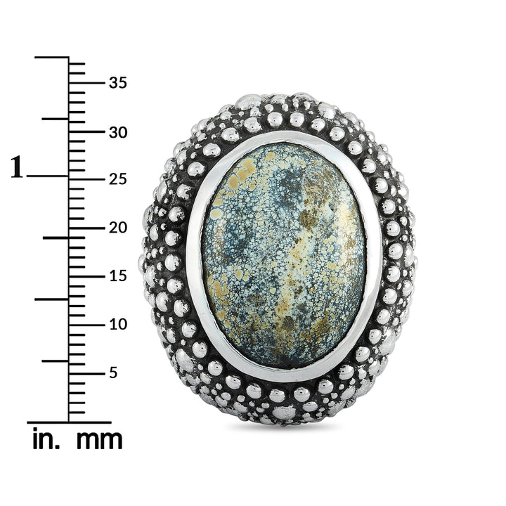Crafted in sterling silver. Features a natural spotted turquoise stone. Band thickness: 10mm. Top height: 13mm. Top dimensions: 27 x 35mm. Weight: 68.1 grams. Includes manufacturer’s box.