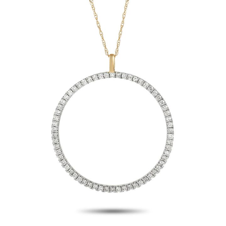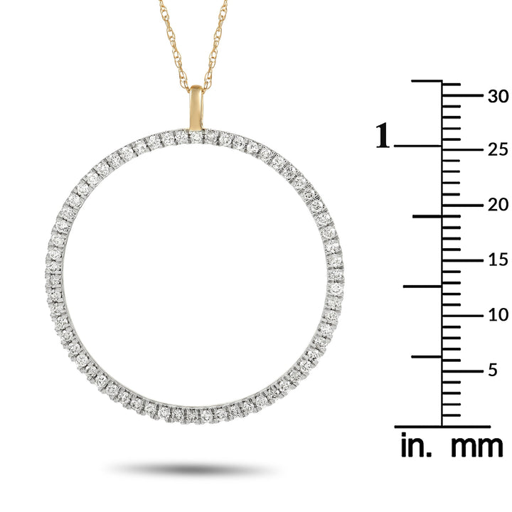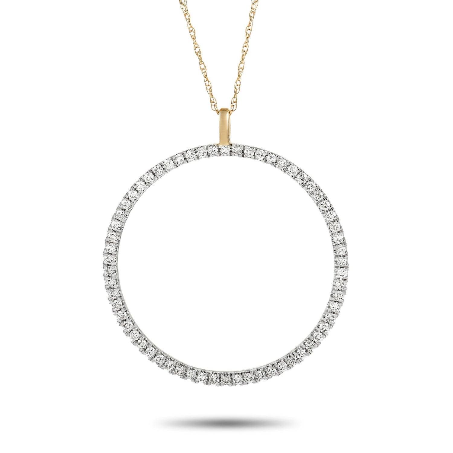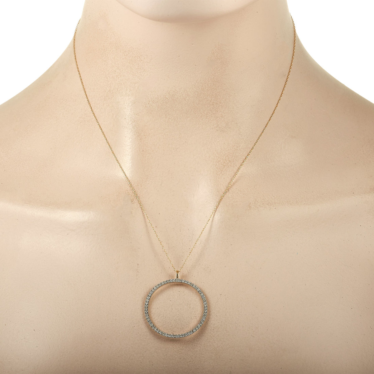 This 14K Yellow Gold 0.50 ct Diamond Necklace by Luxury Bazaar is a sophisticated take on minimalist luxury. Featuring a delicate yellow gold chain and a sleek circular pendant encrusted with 0.50 carats of round-cut diamonds, this necklace is a radiant and timeless addition to any collection.