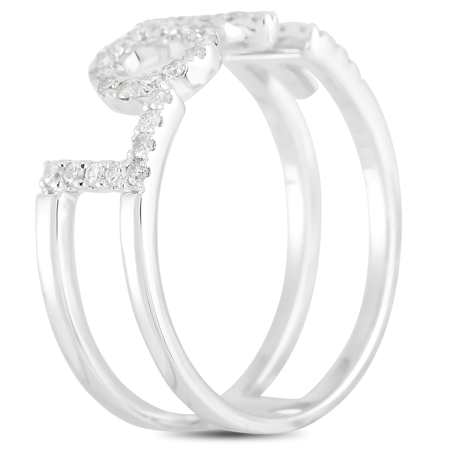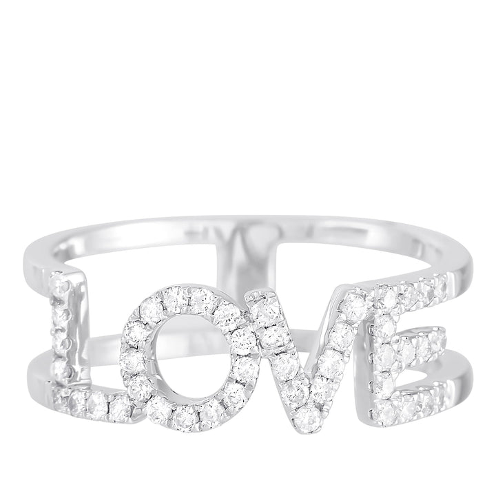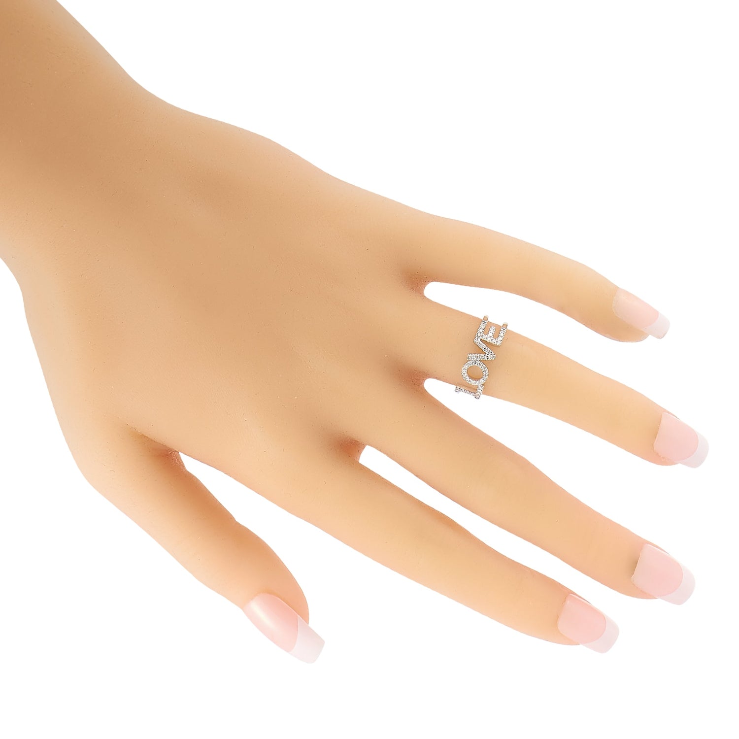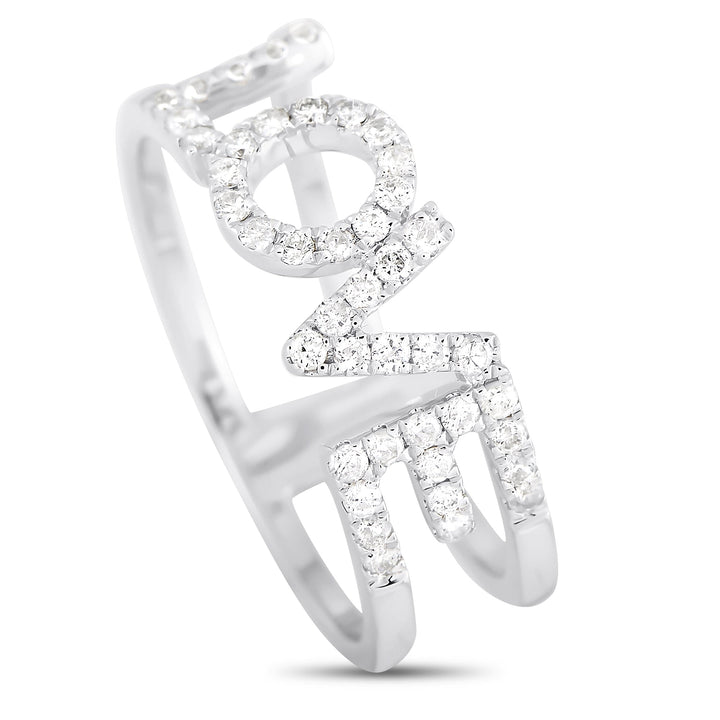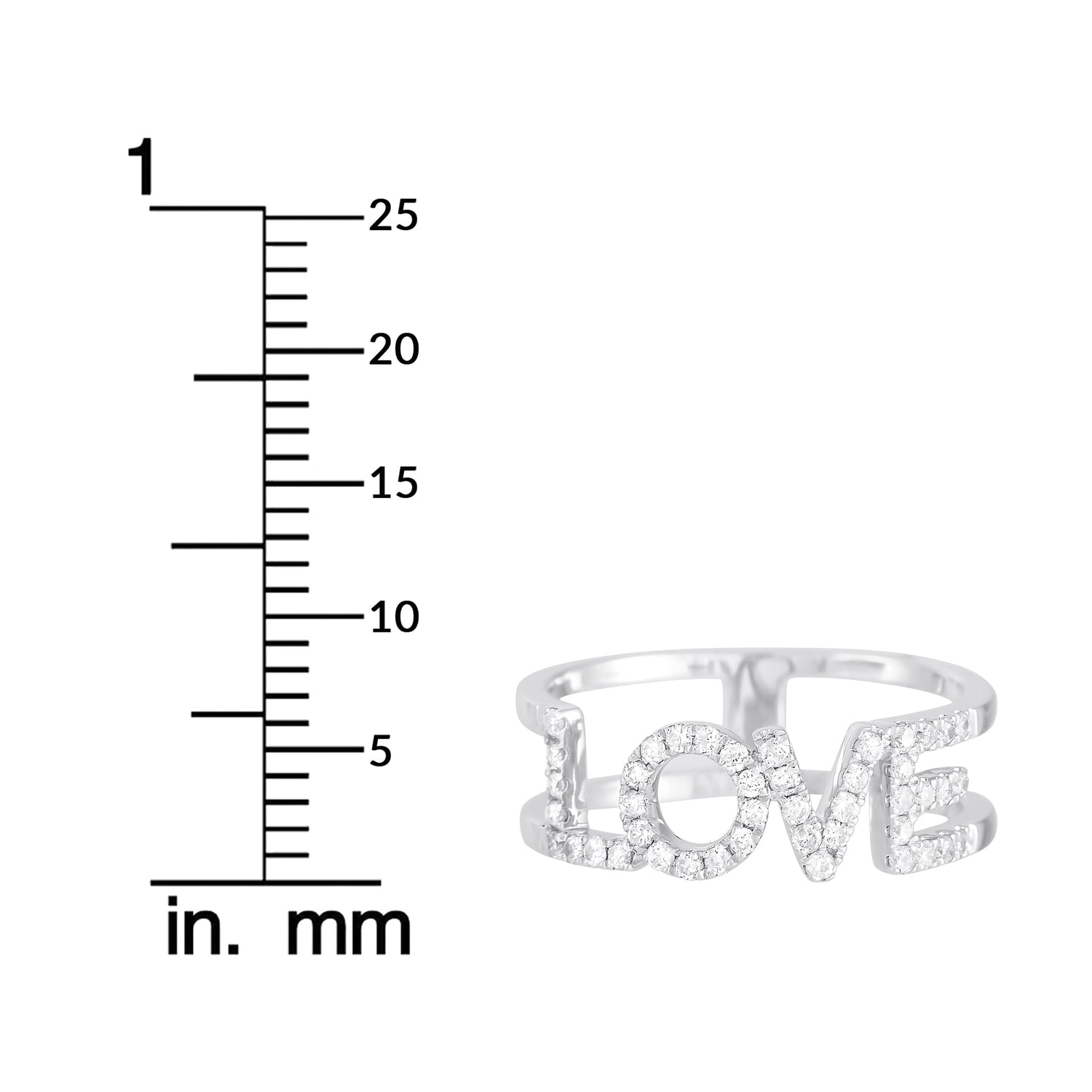 This 14K White Gold 0.35 ct Diamond Love Ring by Luxury Bazaar is a sophisticated and romantic piece. The polished white gold band is adorned with 0.35 carats of sparkling diamonds, arranged in a sleek and modern design. A timeless expression of love and elegance.