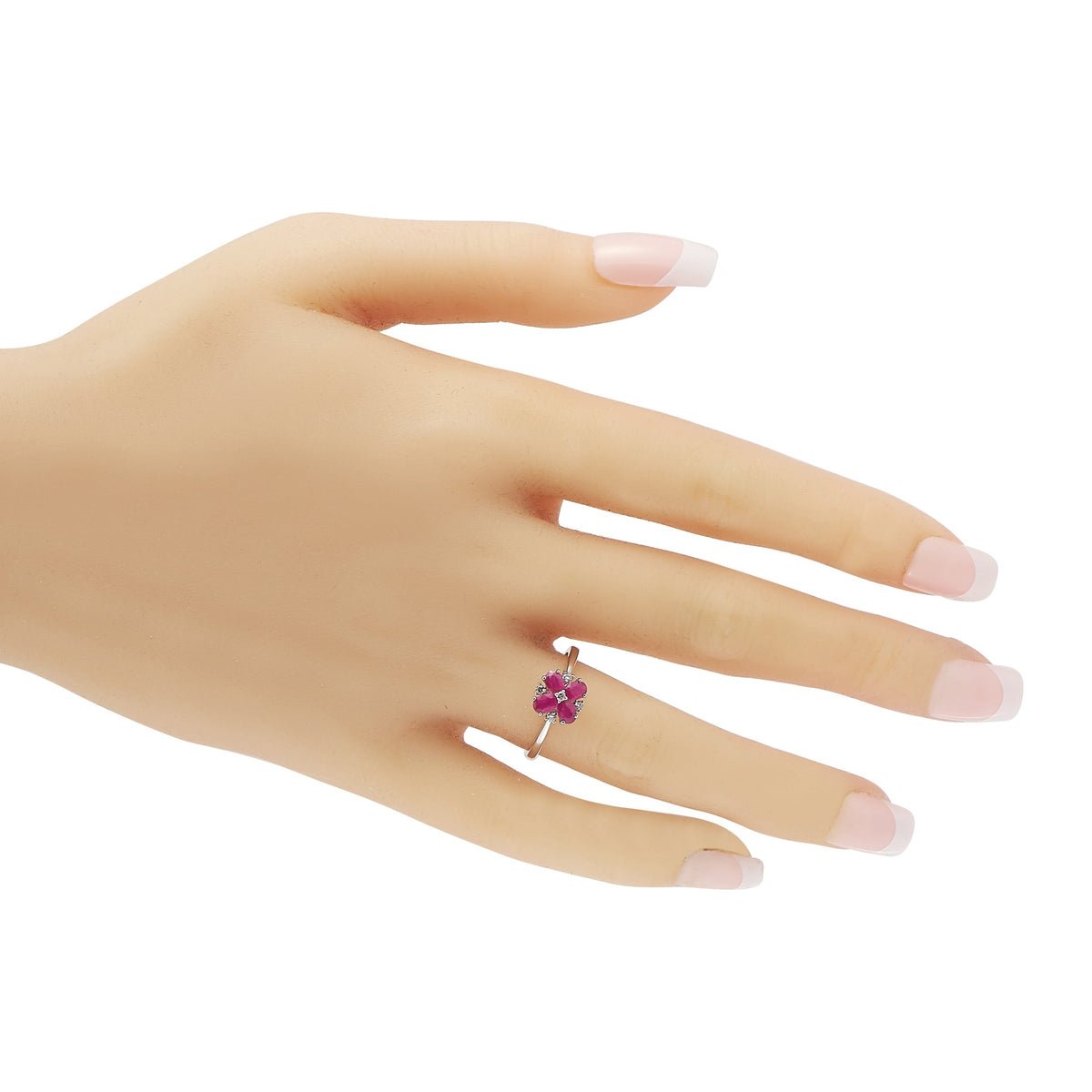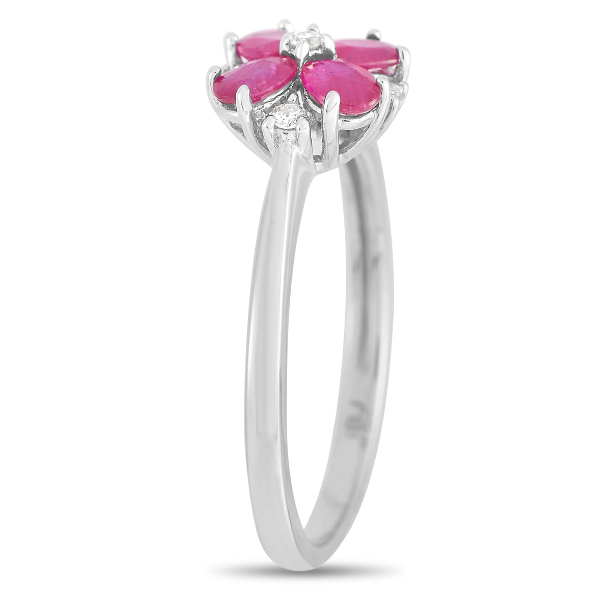 Crafted in 14K white gold. Features oval-cut rubies and 0.08 ctw of natural diamonds. Band thickness: 1mm. Top height: 5mm. Includes gift box.
