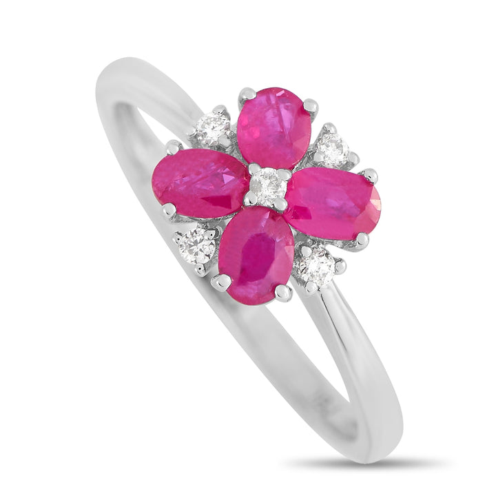 This 14K White Gold 0.08 ct Diamond and Ruby Ring by Luxury Bazaar is a delicate yet vibrant statement. A cluster of oval-cut rubies adds a pop of color, while shimmering diamonds provide a subtle accent. Set in sleek white gold, this elegant ring is a stunning blend of classic and modern.