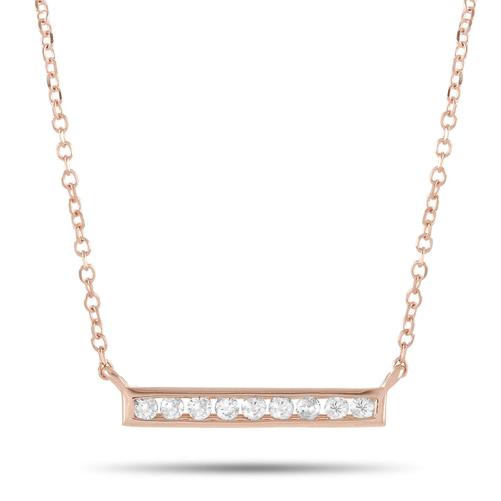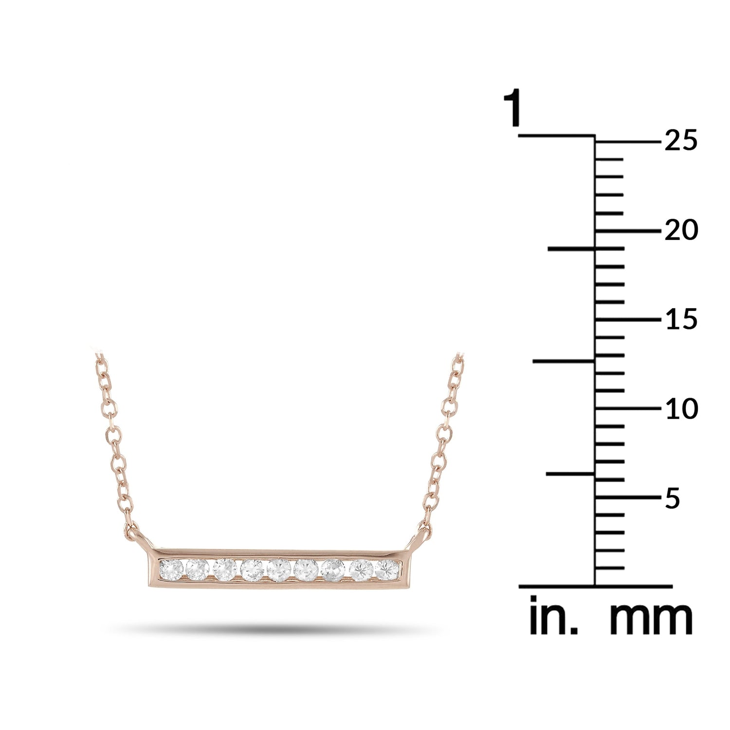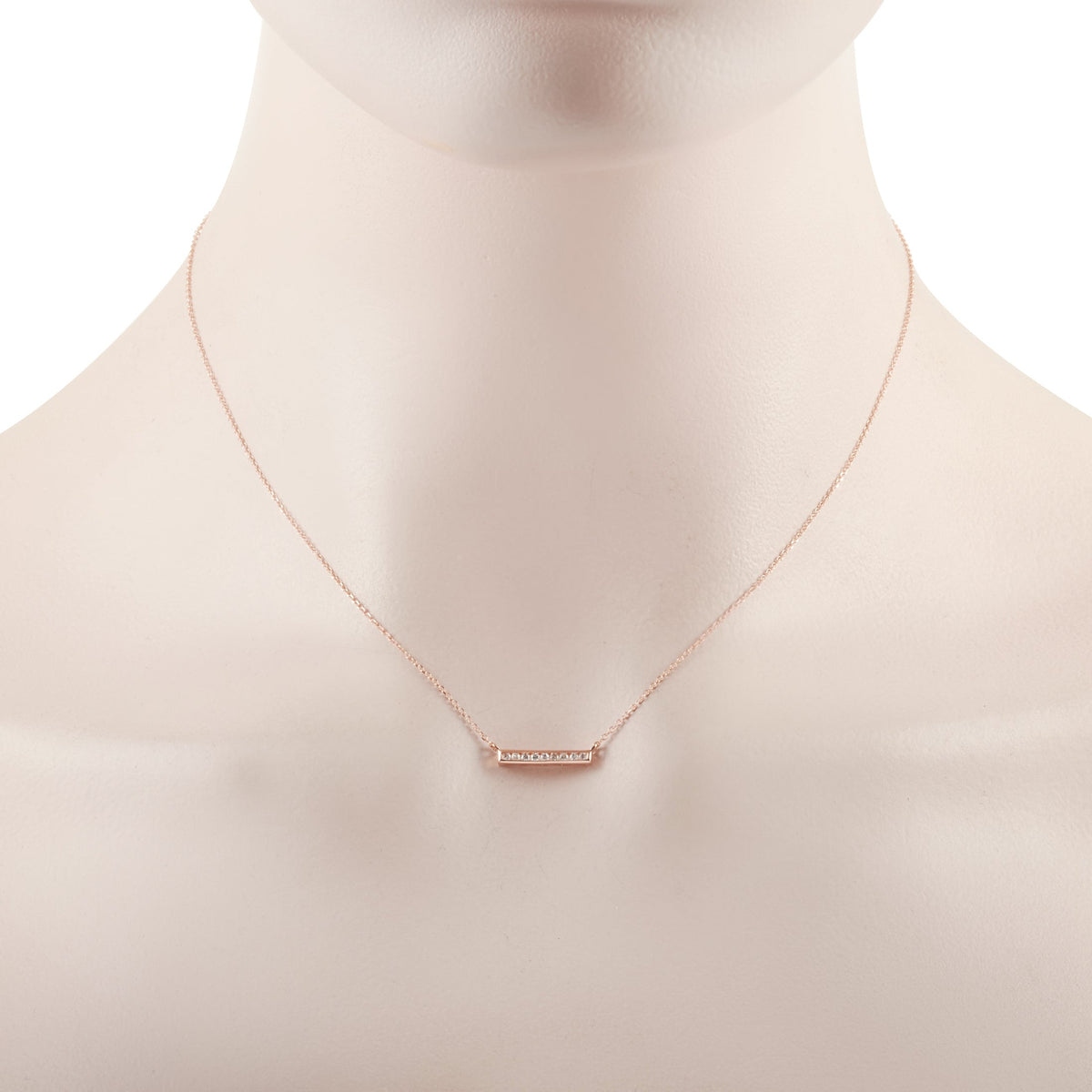 Crafted in 14K rose gold. Features 0.10 ctw of natural diamonds. Pendant dimensions: 0.13 inches x 0.50 inches. Chain length: 15 inches. Weight: 1.6 grams. Includes gift box.