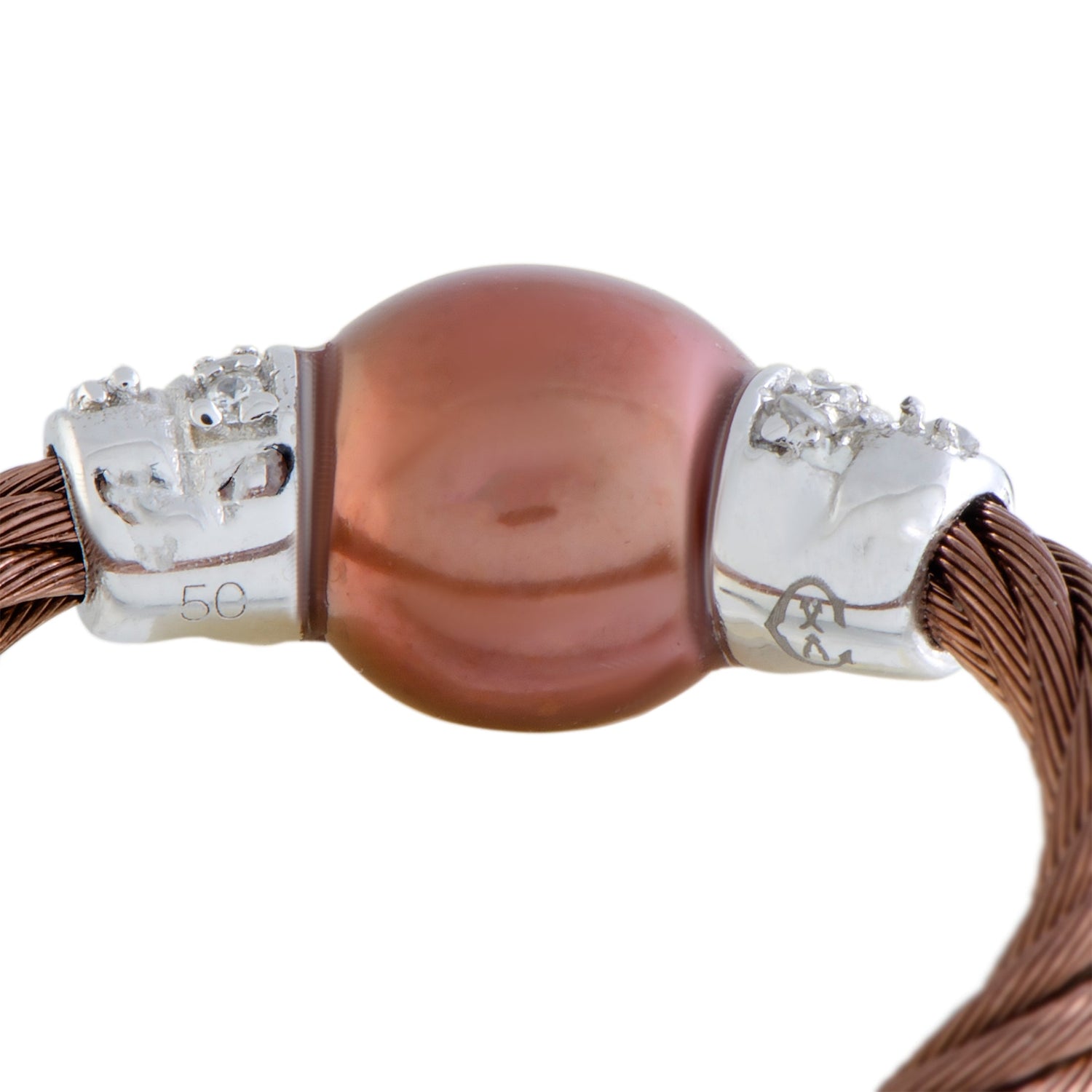 This Pearl Stainless Steel Bronze PVD Brown Pearl and White Cubic Zirconia Cable Ring by Charriol is an elegant blend of texture and shimmer. The partially bronze PVD-coated stainless steel ring is enhanced with a luminous brown pearl and sparkling white cubic zirconia, offering a refined and contemporary look.