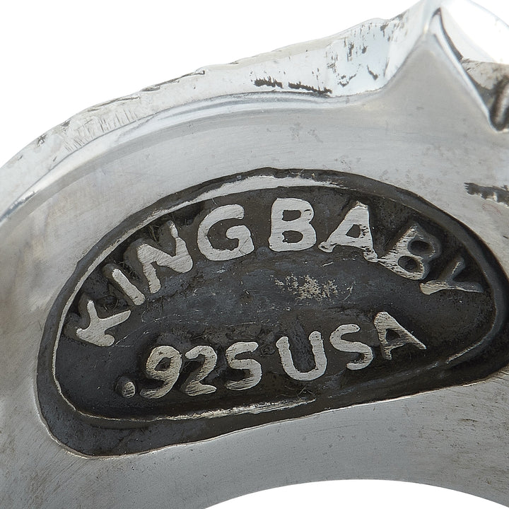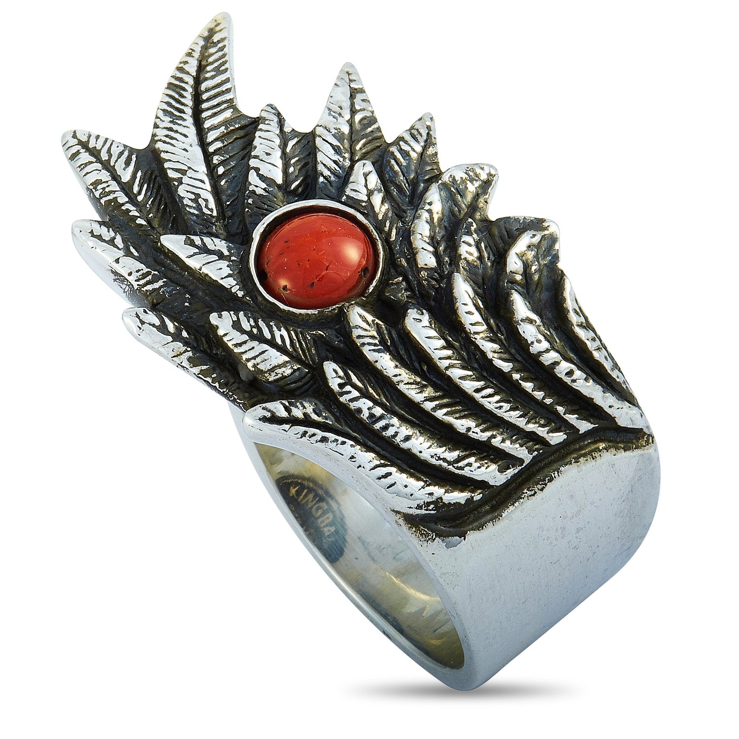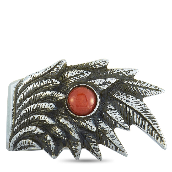 This Raven Wing Sterling Silver and Coral Cabochon Ring by King Baby is a striking and symbolic piece. The bold sterling silver band features an intricately carved raven wing, framing a vivid coral cabochon. A powerful and unique statement ring.