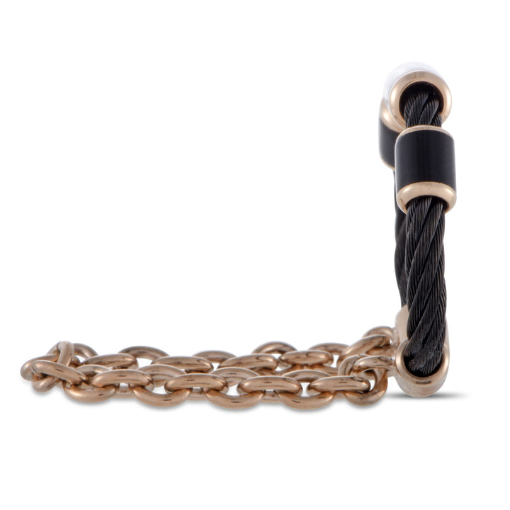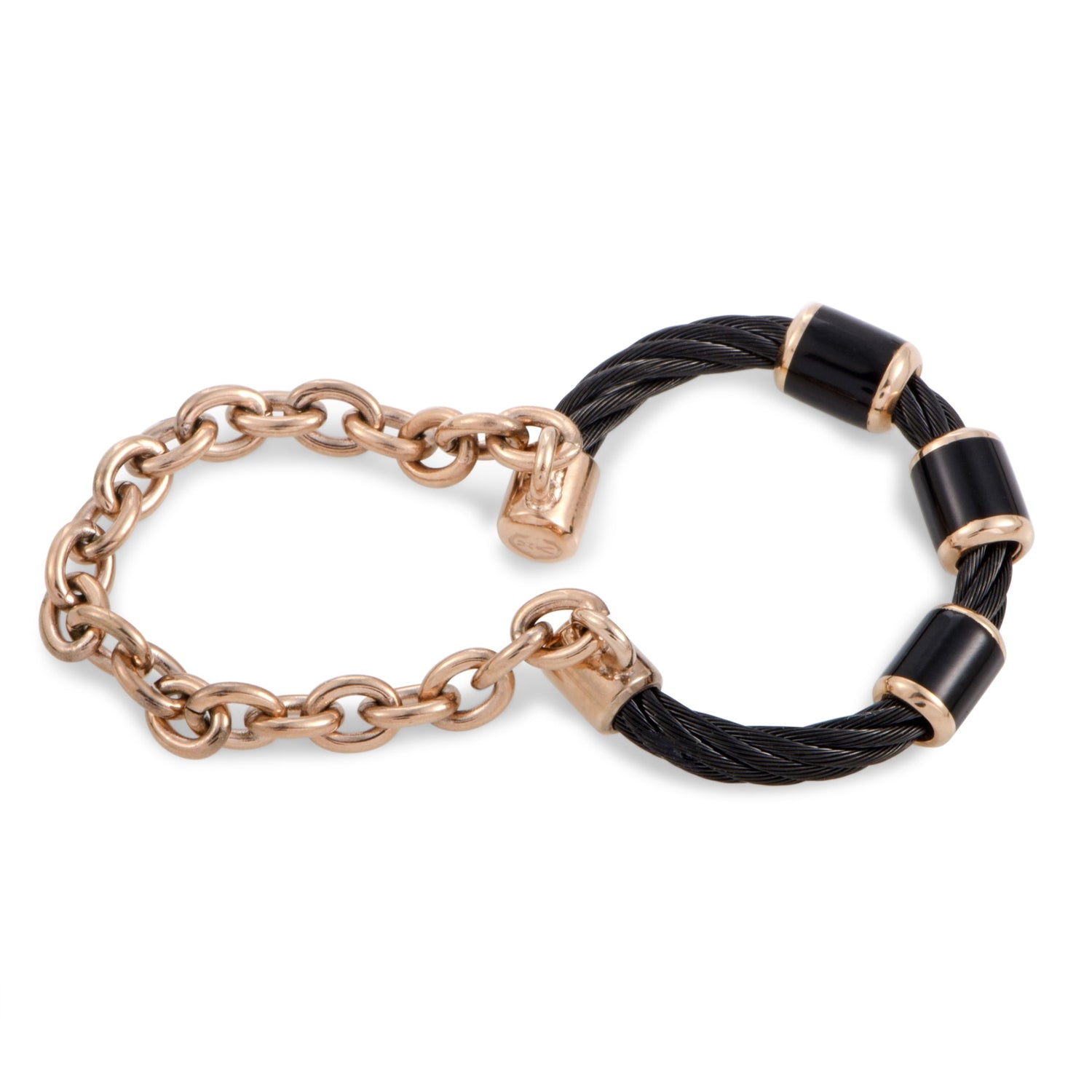 This St. Tropez Stainless Steel Pink and Black PVD Black Enamel Cable and Chain Band Ring by Charriol is a refined blend of edgy and elegant. The signature cable motif is accentuated with pink and black PVD coating, while black enamel details add a modern contrast, making this ring a bold addition to any collection.