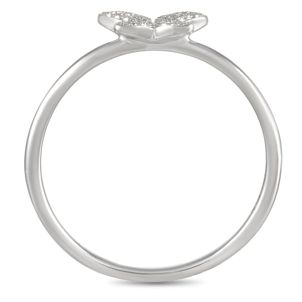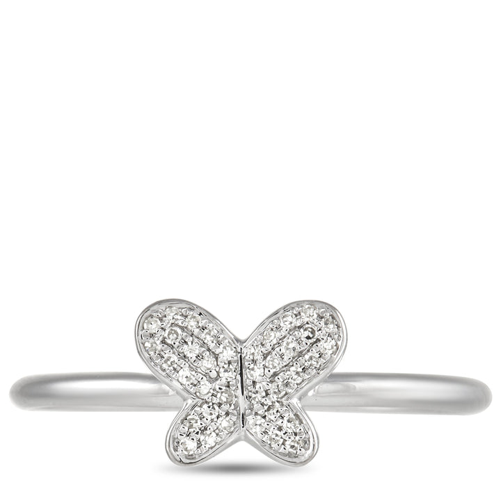 Crafted in 14K white gold, this ring features a butterfly design set with 0.08 carats of diamonds. The band is 1mm wide with a top height of 2mm.