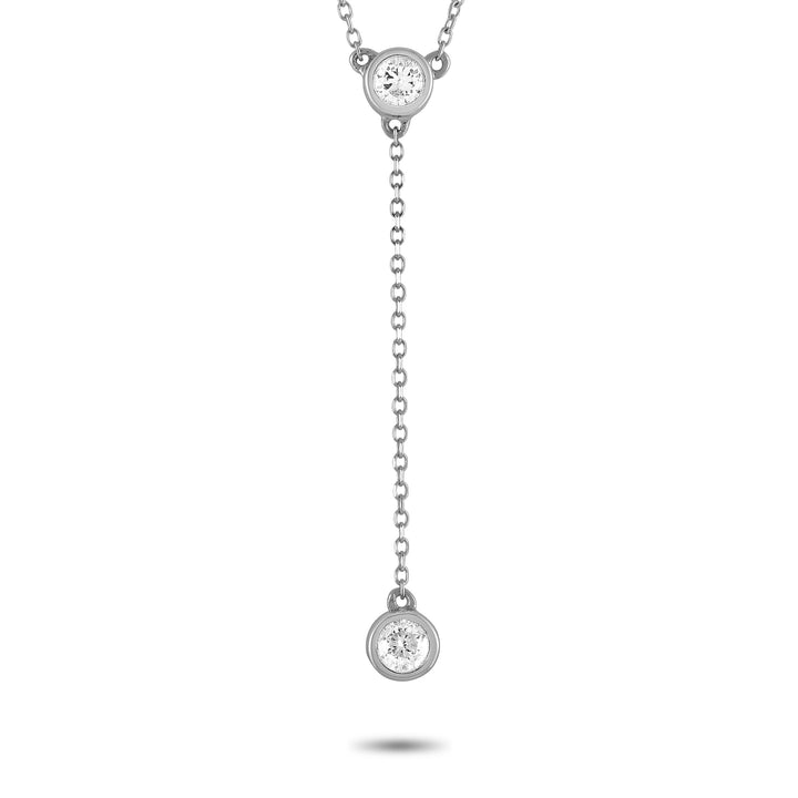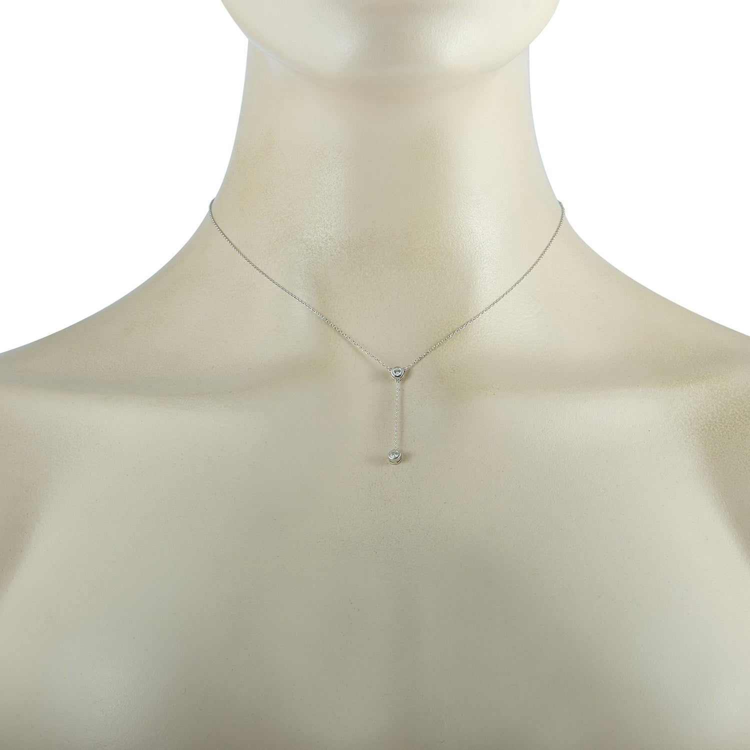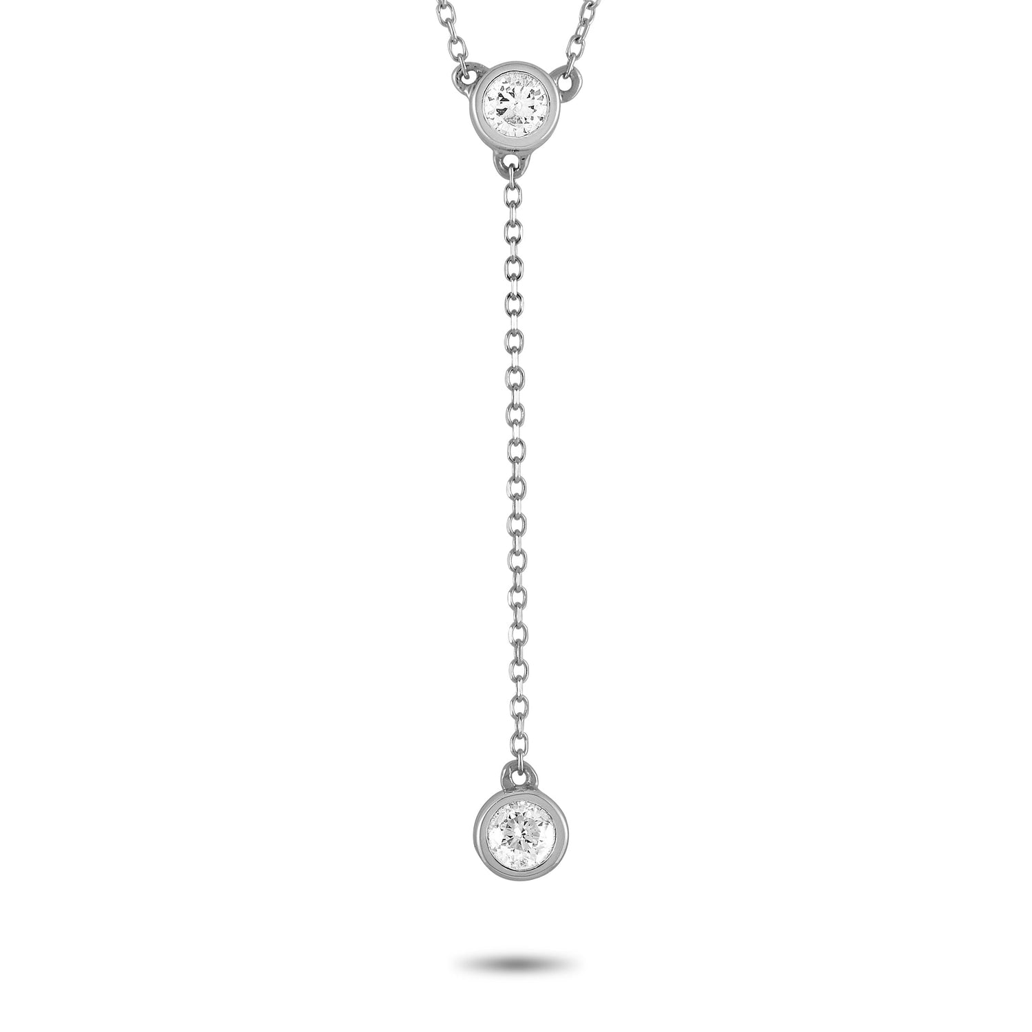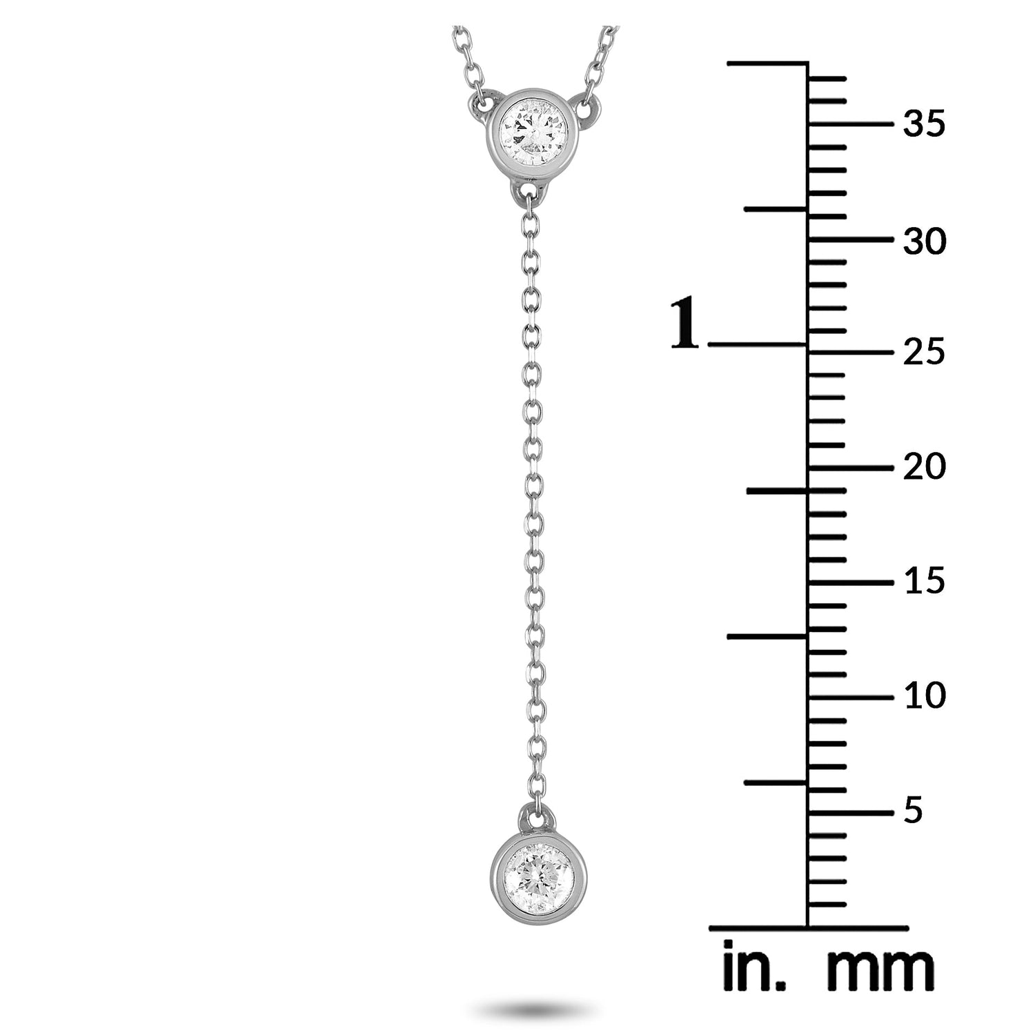 Crafted in 14K white gold, this pendant weighs 1.7 grams. It measures 1.45” in length and 0.15” in width, with 0.20 carats of diamonds set for a delicate, radiant effect. It is suspended on a 15” chain.