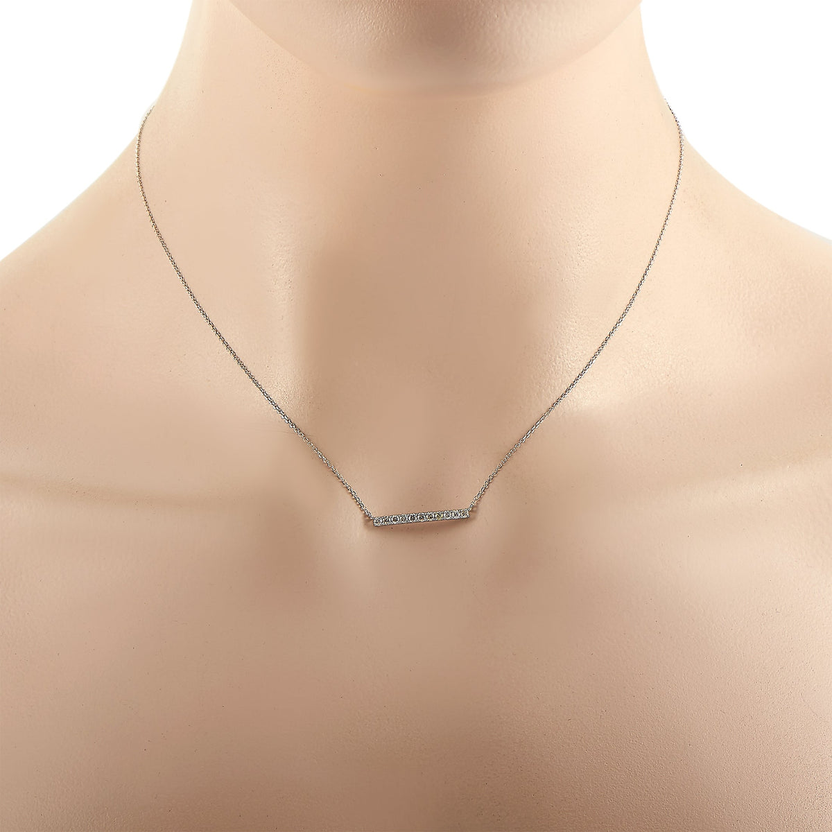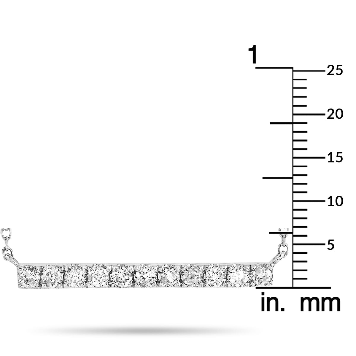 Made from 14K white gold, this necklace weighs 2 grams and is set with 0.25 carats of diamonds. The pendant measures 0.15” in length and 0.75” in width, and is presented with a 16” chain.