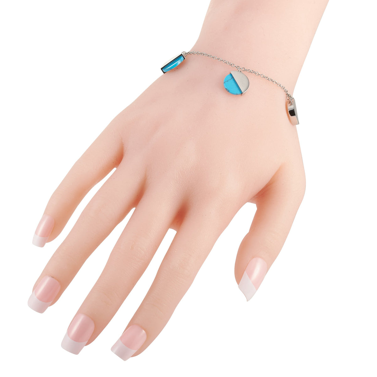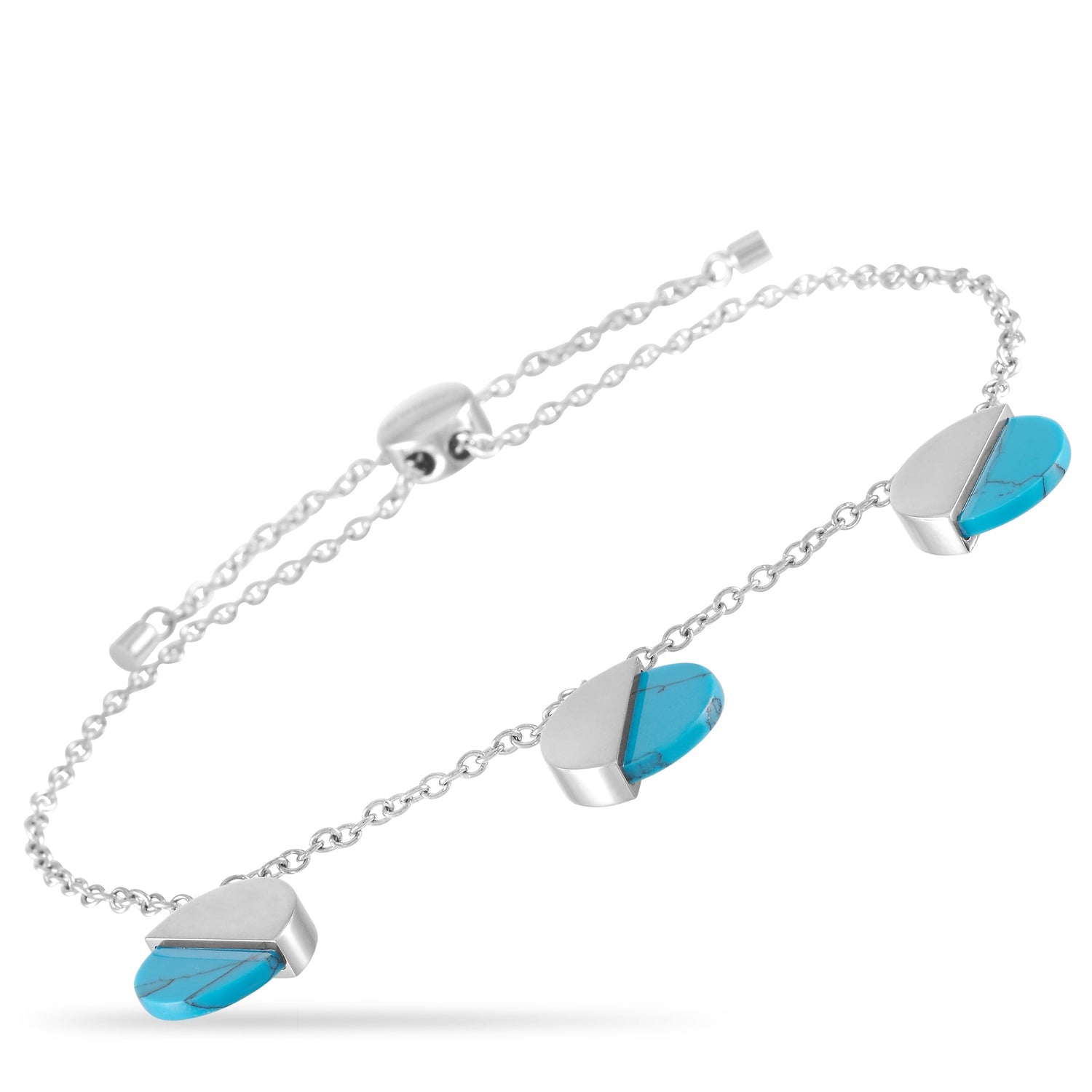 This Spicy Stainless Steel Turquoise Bracelet by Calvin Klein is a contemporary piece that blends sleek metal with vibrant color. The bracelet features polished stainless steel links, each accented with rich turquoise stones, creating a bold yet versatile look. The dynamic contrast of cool metal and warm-hued gemstones makes this bracelet a striking addition to any outfit.