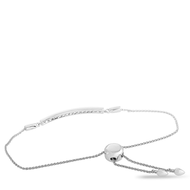 Crafted from 14K white gold and adorned with 0.25 ct diamonds. This bracelet is adjustable up to 9.25” in length and weighs 4.5 grams. Comes with a gift box.