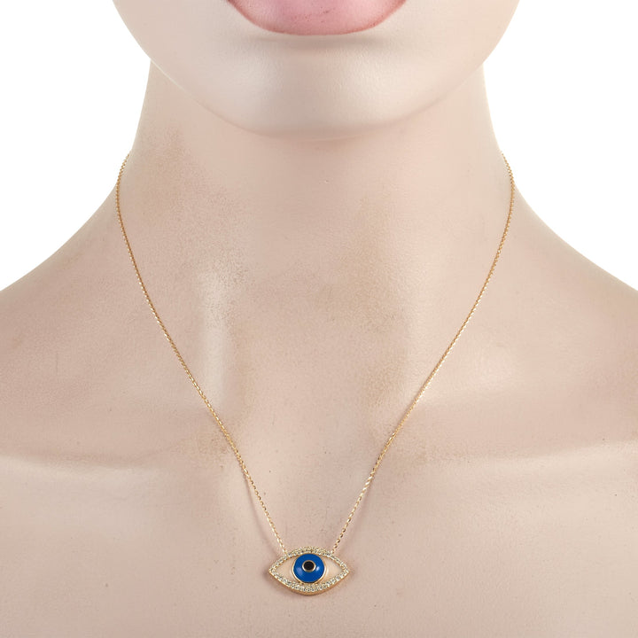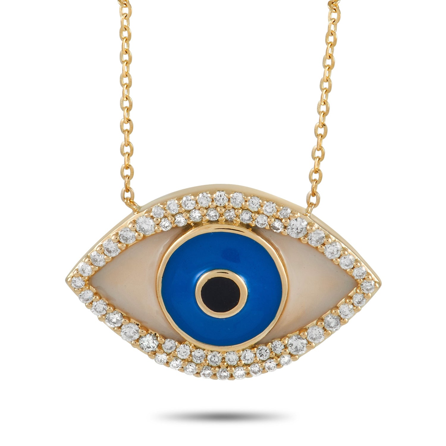 14K Yellow Gold 0.38 ct Diamond Eye Necklace by Luxury Bazaar features a bold design with a 14K yellow gold chain and a matching eye pendant. The pendant is set with three stone inlays in cream, blue, and black, surrounded by two rows of round-cut diamonds totaling 0.38 carats. The chain measures 17 inches, and the pendant measures 0.85 inches in length and 0.50 inches in width. Presented in brand new condition with a gift box.
