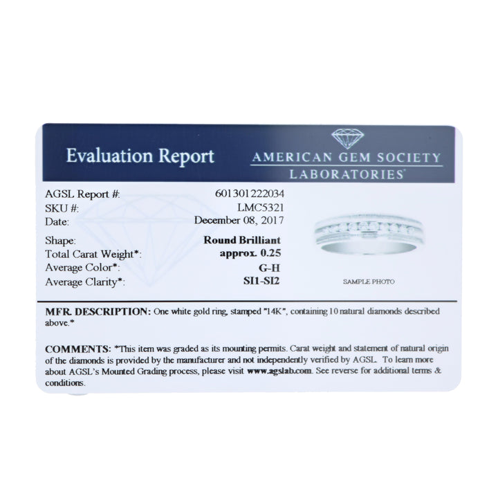 Made with 1/4 cttw SI1-SI2 clarity natural diamonds in a 14K white gold band. The ring features 10 diamonds, weighing 4.5 grams with a width of 4.9mm. AGS Certified, and the certificate is included with the purchase.
