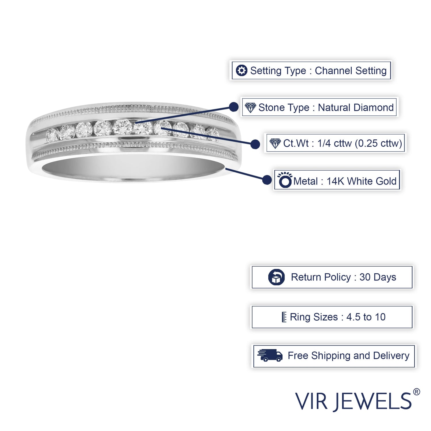 This 1/4 cttw SI1-SI2 Certified Machine Diamond Wedding Band Milgrain 14K Gold by Vir Jewels is an exquisite example of craftsmanship and timeless elegance. The diamonds are carefully set in a 14K white gold band, with delicate milgrain detailing for a vintage-inspired touch. Certified by AGS, this band is a perfect choice for a wedding or an anniversary gift.
