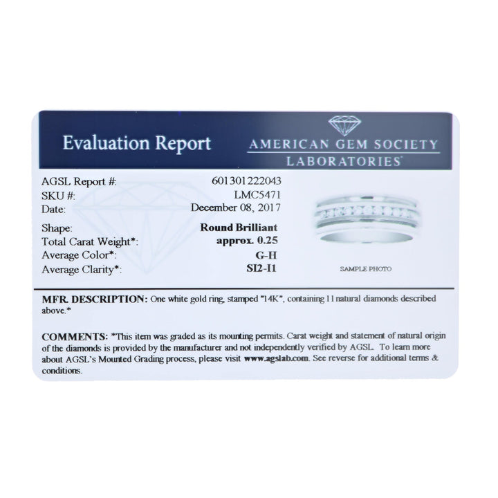 Made with 11 natural diamonds (1/4 cttw) set in 14K white gold. The diamonds have SI2-I1 clarity and G-H color. The ring weighs 7.5 grams with a width of 6.8mm. AGS Certified, with certificate included.