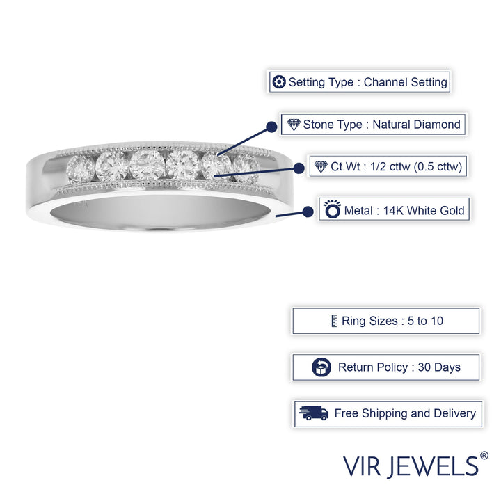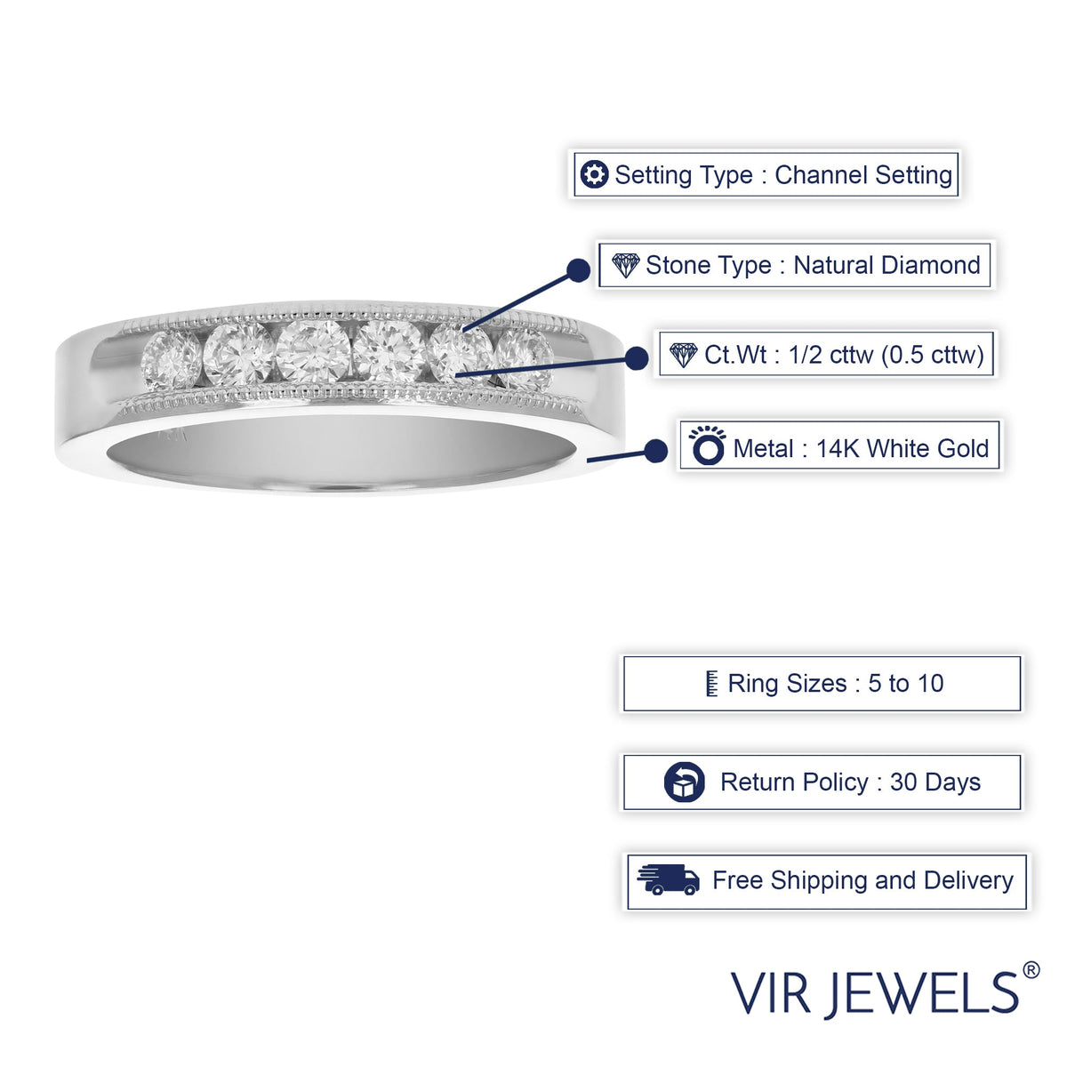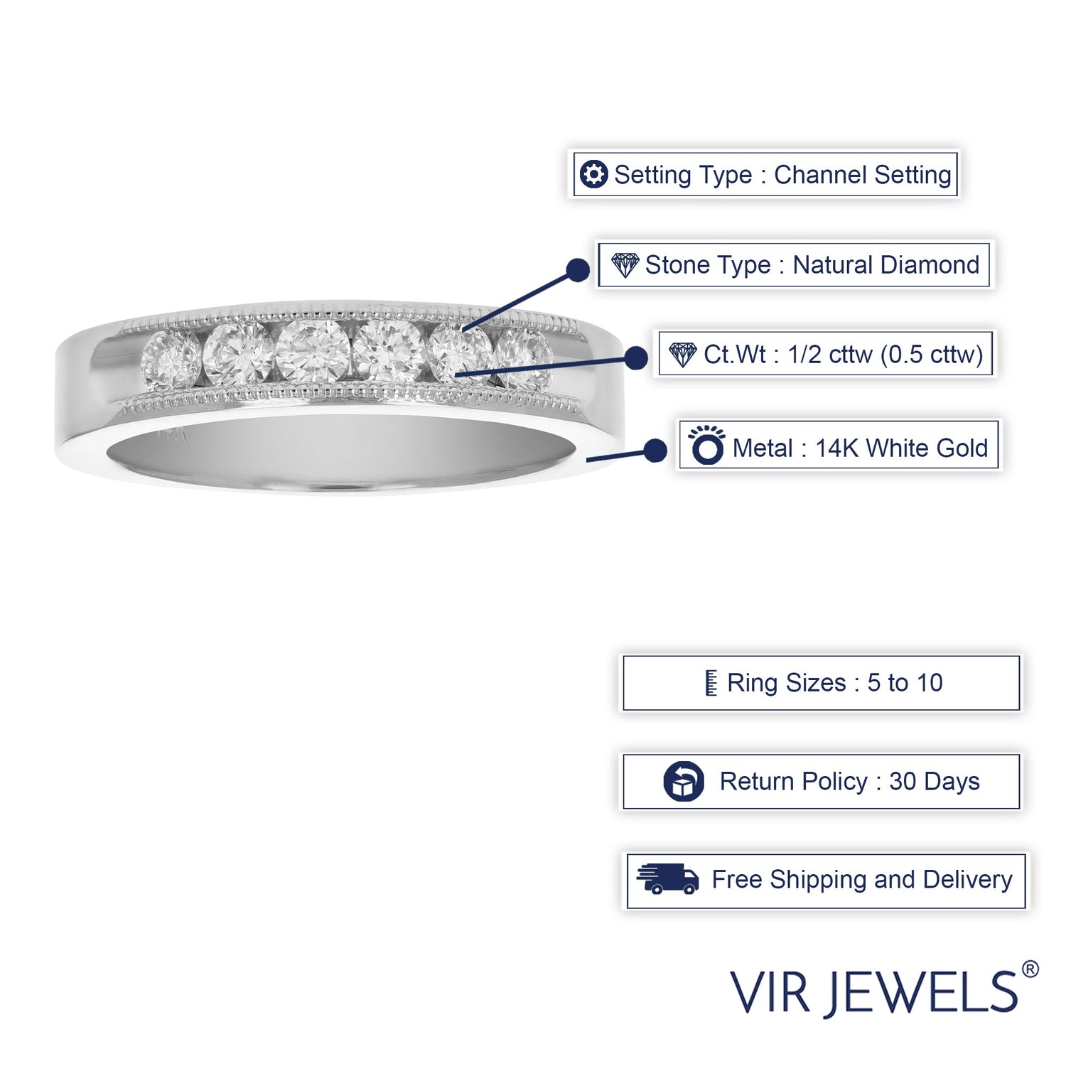 This 1/2 cttw SI2-I1 14K Gold Machine Set Diamond Wedding Band Milgrain by Vir Jewels exudes elegance with its intricate milgrain detailing and classic diamond setting. The 6 natural diamonds bring a subtle brilliance, while the band’s design offers a vintage-inspired look. Whether as a wedding band or a special addition to your jewelry collection, this ring delivers timeless appeal.