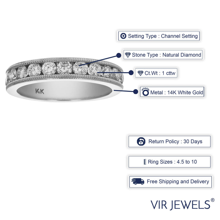 This 1 cttw SI2-I1 14K White Gold Machine Set With Milgrain Diamond Wedding Band combines refined milgrain detailing with 11 natural diamonds. Set in 14K white gold, the diamonds have SI2-I1 clarity and I-J color, making this wedding band a timeless and sophisticated choice.