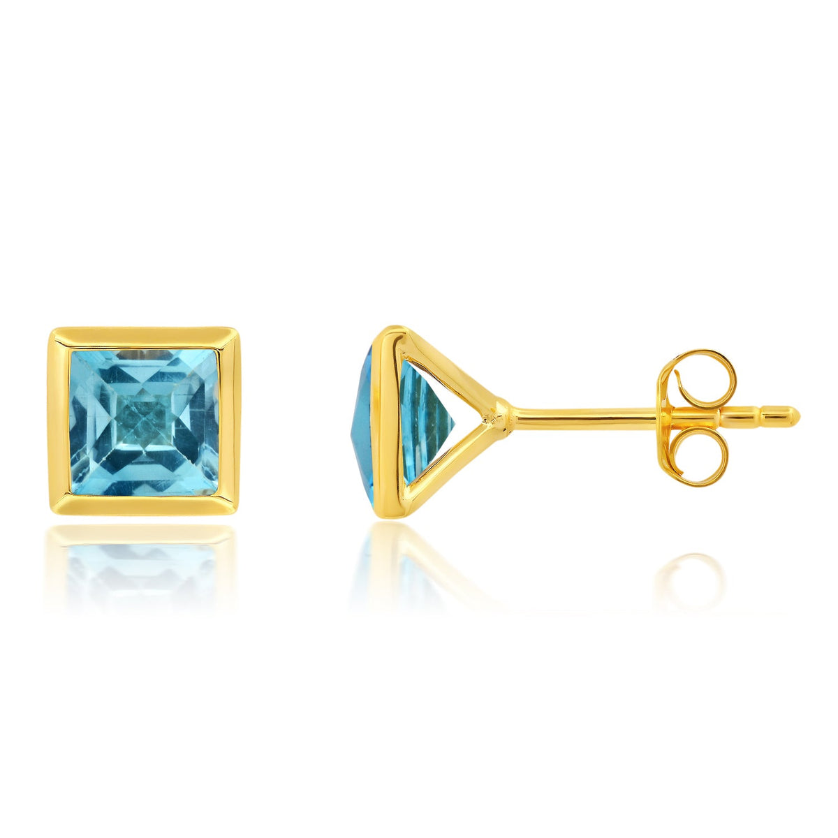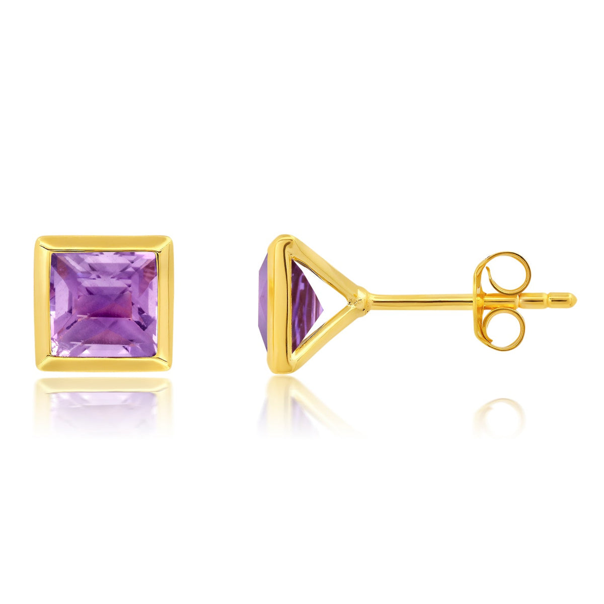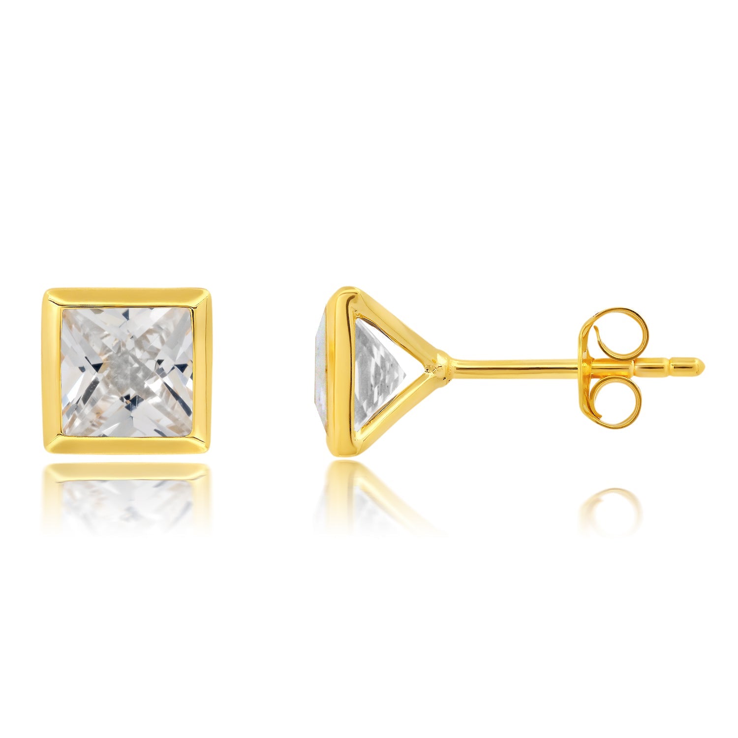 Sterling Silver and 14k Yellow Gold Plated Princess Cut 6mm Gemstone Square Stud Earrings from Nicole Miller offer a classic look with a modern twist. These stud earrings feature princess-cut gemstones in a square setting with push-back closures.