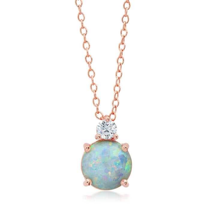 18k Rose Gold Overlay over Sterling Silver Round Created Opal Pendant Necklace with CZ Accents on 18 Inch Adjustable Chain