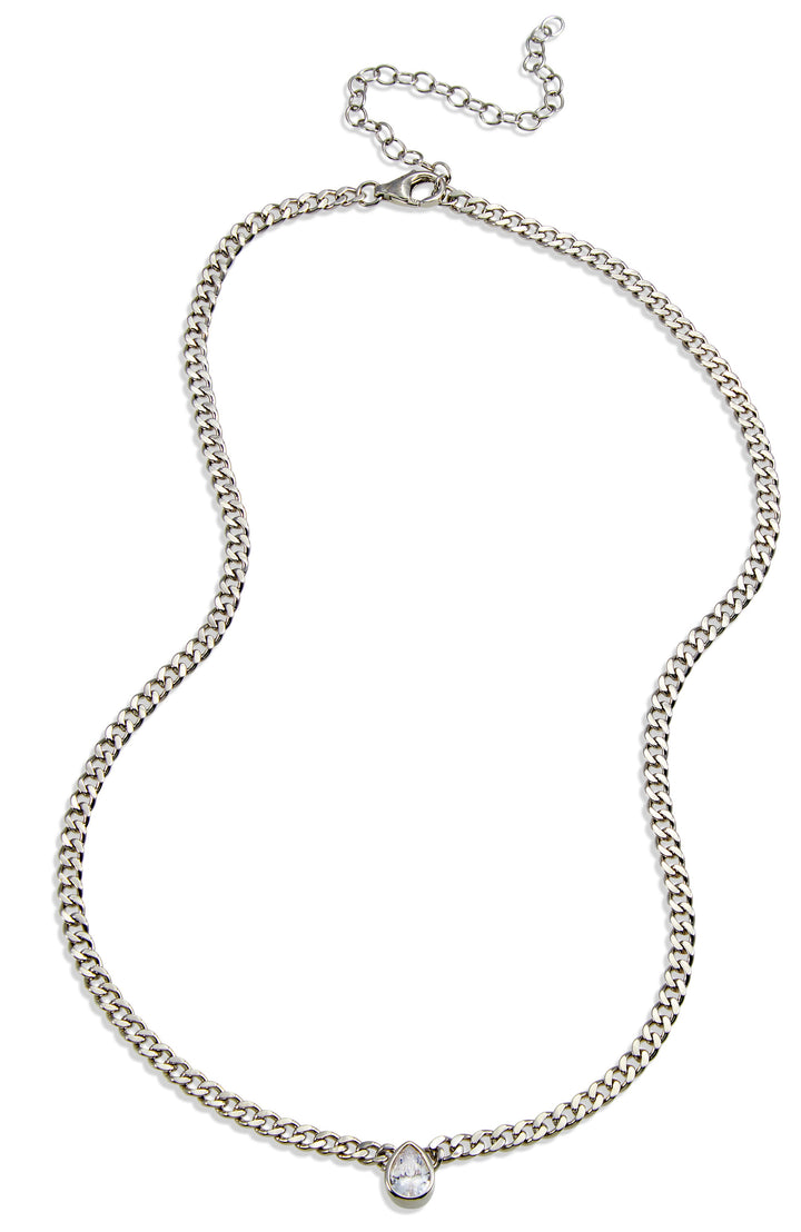 18k Gold Plated Pear CZ Necklace by Savvy Cie features an eye-catching pear cubic zirconia. This beautiful Cuban link piece adds a bold, stylish touch to any outfit.