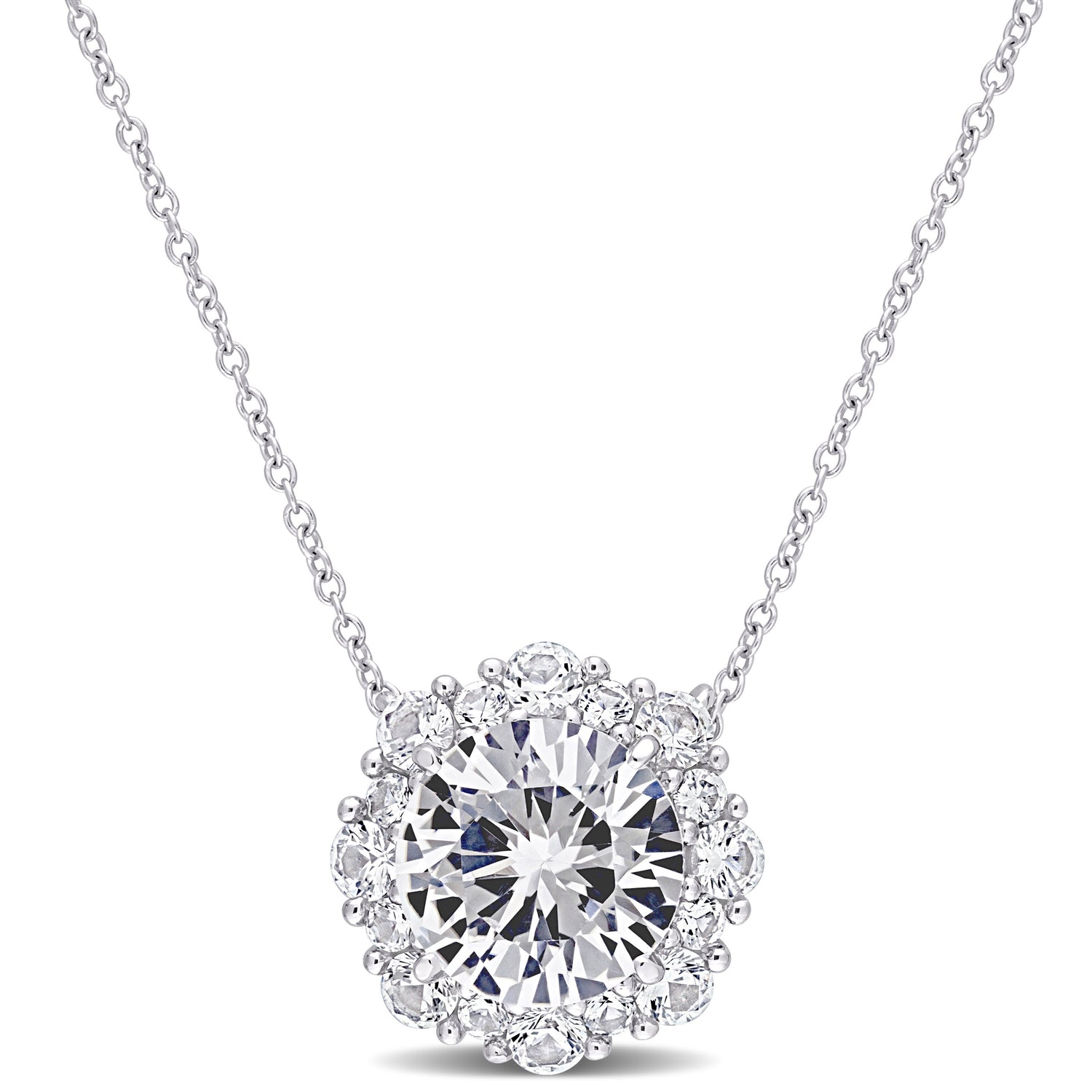 4 3/8 CT TGW Created White Sapphire Halo Pendant with Chain in 10k White Gold by Mimi & Max features 17 round-cut, prong-set created white sapphires in a unique halo design on a 10k white gold chain. An elegant and versatile pendant for various occasions.