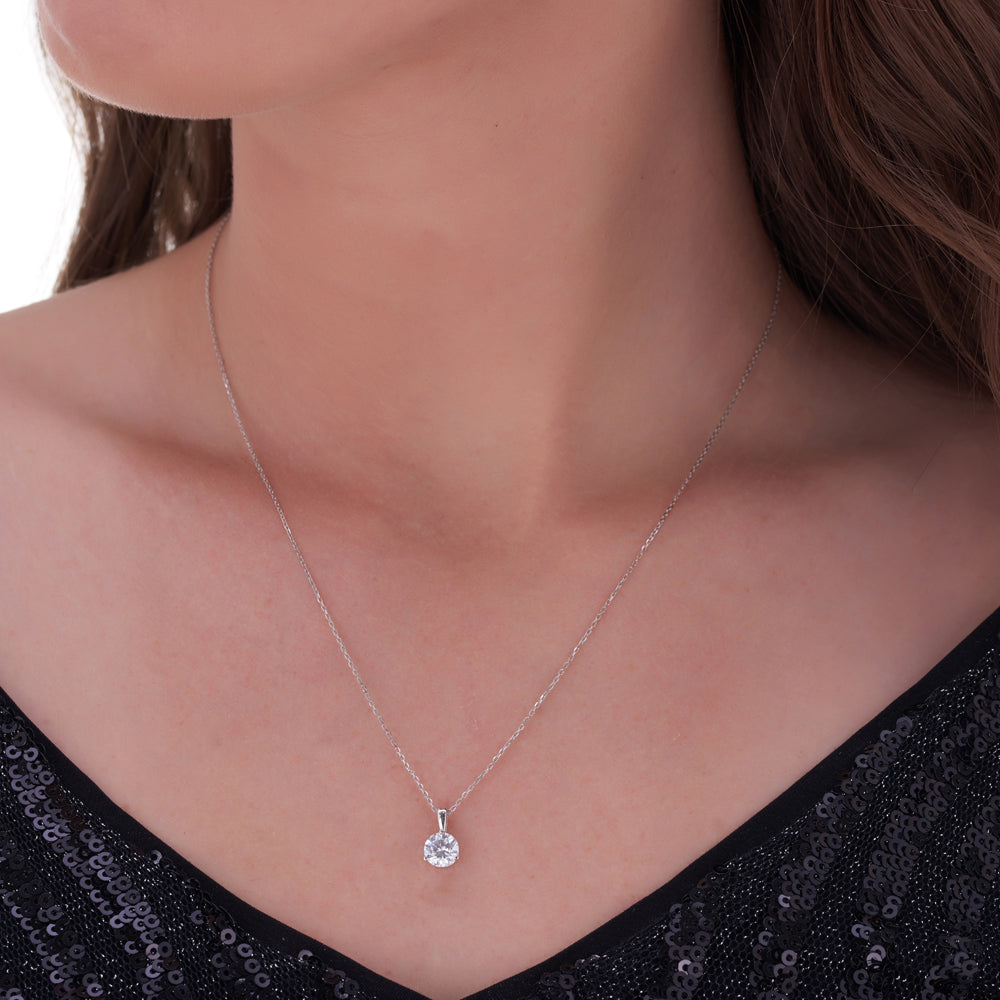 5/8 round-cut lab-grown diamond, set in 14K gold or platinum, with an 18-inch spring ring chain.