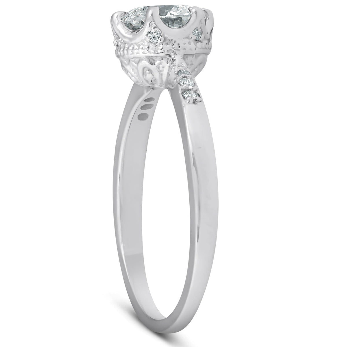 1 ct round-cut lab-grown diamond, 18 round-cut accent diamonds, prong-set in 14k white gold with royal-style mounting.