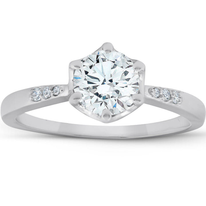 The 1 1/10Ct TDW Diamond Round Cut Vintage Engagement Ring in 14k White Gold by Pompeii3 is a royal-style, vintage-inspired engagement ring. It features a 1 ct round-cut lab-grown diamond, prong-set in solid white gold, with 18 round-cut diamonds accenting the main stone in a high-polish royal-style mounting.