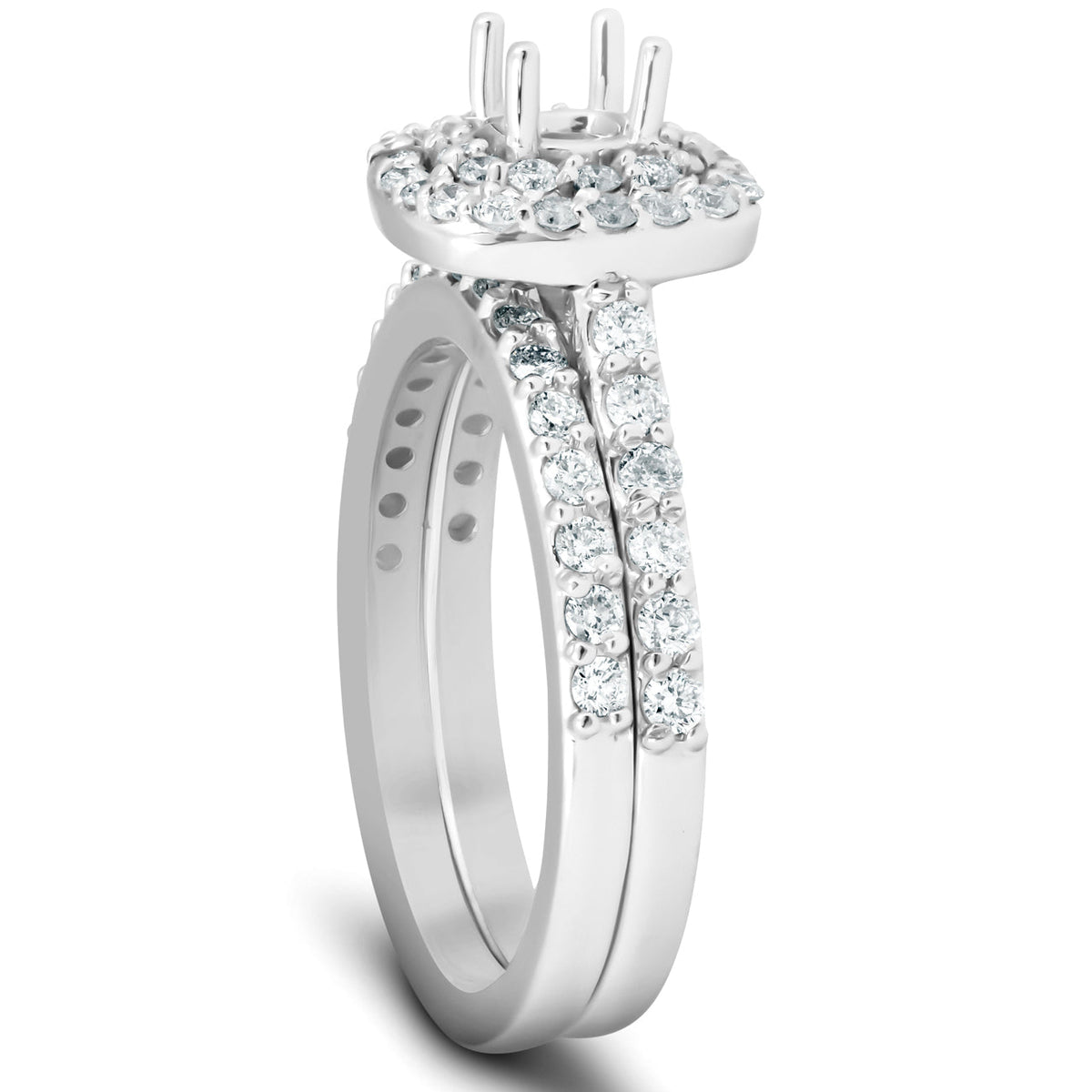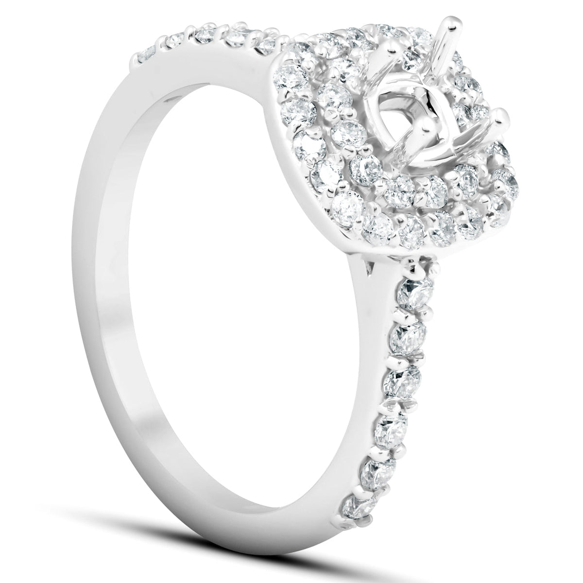 Handcrafted in 14k white gold, featuring 62 round cut genuine diamonds prong set in high polished finish. Mounting ready to fit a 4mm cushion or round center stone. Matching wedding band included.