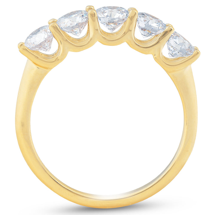 This 1 1/4 Ct Lab Grown Diamond Five Stone Wedding Ring by Pompeii3 Rings showcases five round brilliant cut sparkling lab-grown diamonds, prong set in a U-prong setting. The high polished 14k yellow gold band adds a rich, warm contrast to the diamonds' brilliance.