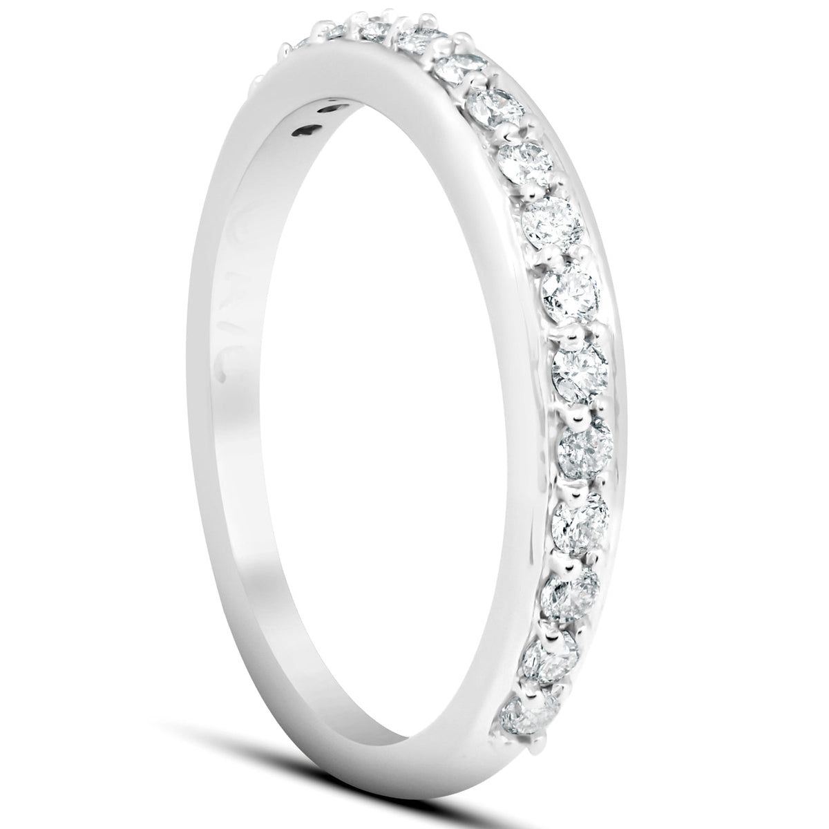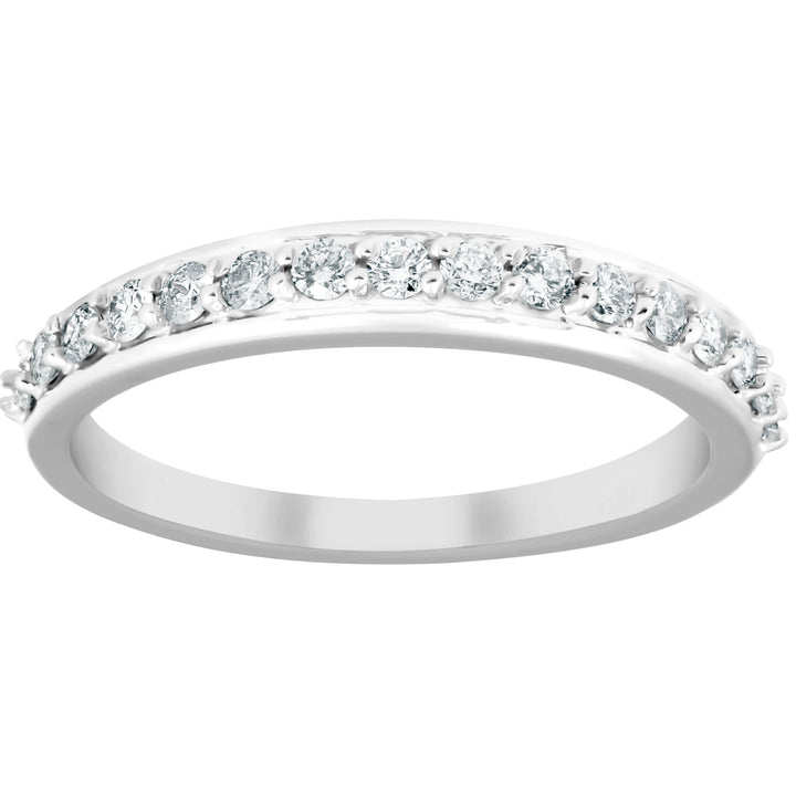This 1/3 Ct Diamond Wedding Ring by Pompeii3 Rings features 16 round cut genuine diamonds, each prong set in solid 14k white gold. The high polished finish adds a sleek and sophisticated look, making it the perfect band for stacking with other rings or pairing with an engagement ring. This timeless piece is designed for those who appreciate subtle elegance and versatile styling.
