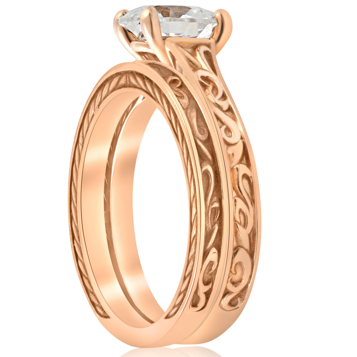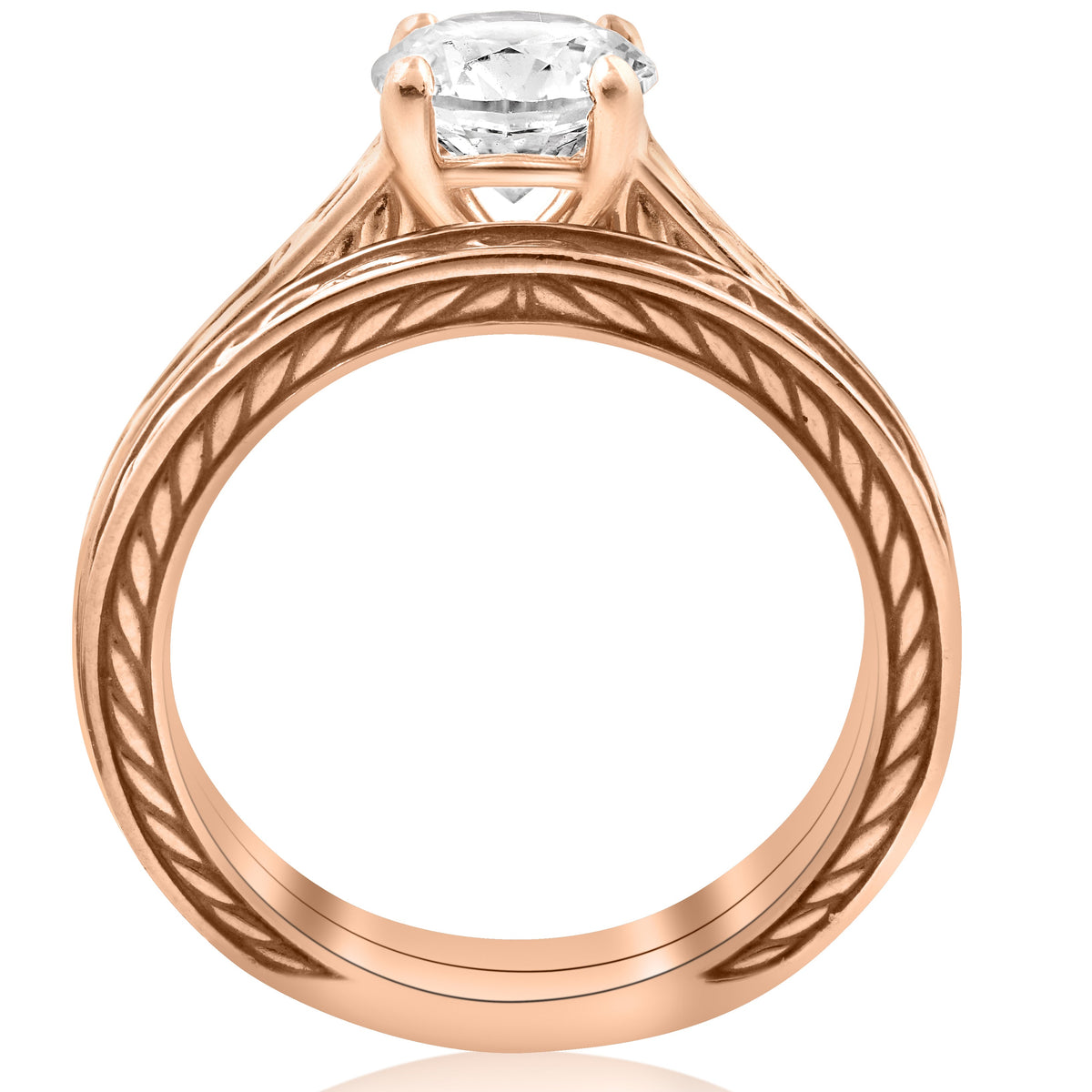 1ct Diamond Solitaire 14k Rose Gold Vintage Engagement Ring Wedding Band