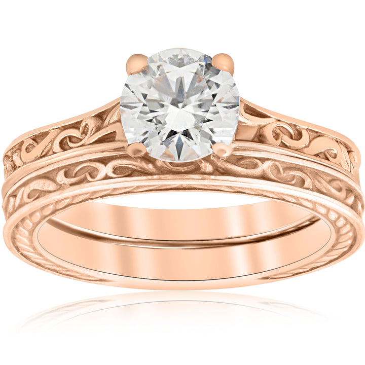 1ct Diamond Solitaire 14k Rose Gold Vintage Engagement Ring Wedding Band by Pompeii3 Rings features a 1ct round brilliant cut clarity enhanced diamond in an antique vintage setting. The hand-carved filigree swirls add an elegant touch, and the matching wedding band completes the set.